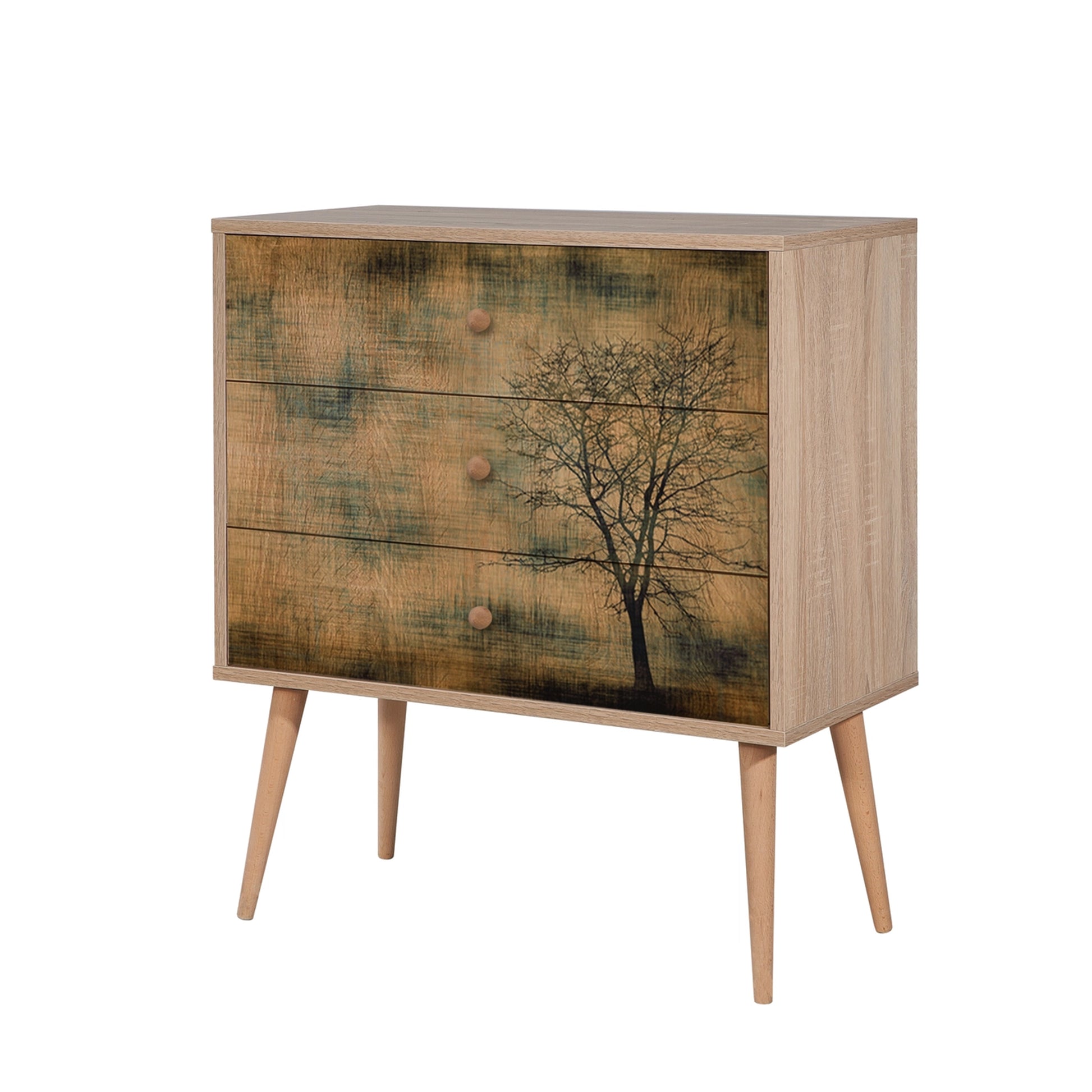 City Trio Sonomo Desenli Şifonyer, yatak odanızda depolama ihtiyacını sanatla buluşturur. 80 cm genişliği ve derin iç hacme sahip 3 adet çekmecesiyle kıyafetleriniz ve kişisel eşyalarınız için geniş bir alan sunar. Sonomo rengi üzerine uygulanan özel UV dijital baskı deseni ve 30 cm yüksekliğindeki masif konik ayakları, ürüne retro ve modern bir kimlik kazandırır.
