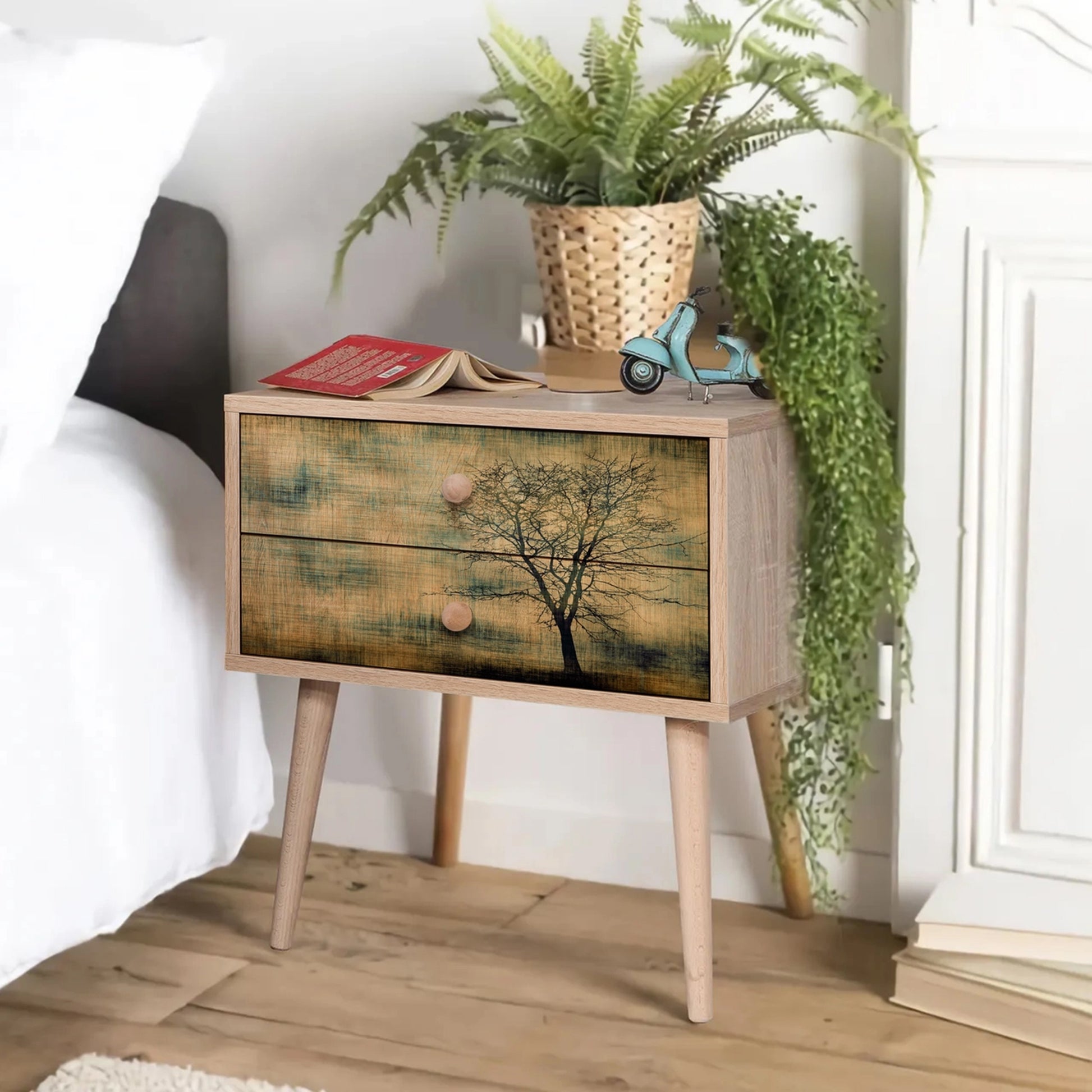 City Two Sonomo Desenli Komodin, yatak odanızda hem işlevsel bir saklama alanı hem de sanatsal bir detay olarak yerini alır. 60 cm genişliği ve iki adet geniş çekmecesiyle başucu ihtiyaçlarınız için idealdir. Sonomo rengi üzerine uygulanan özel UV dijital baskı deseni ve 30 cm yüksekliğindeki masif konik ayakları, ürüne modern ve ferah bir görünüm kazandırır.