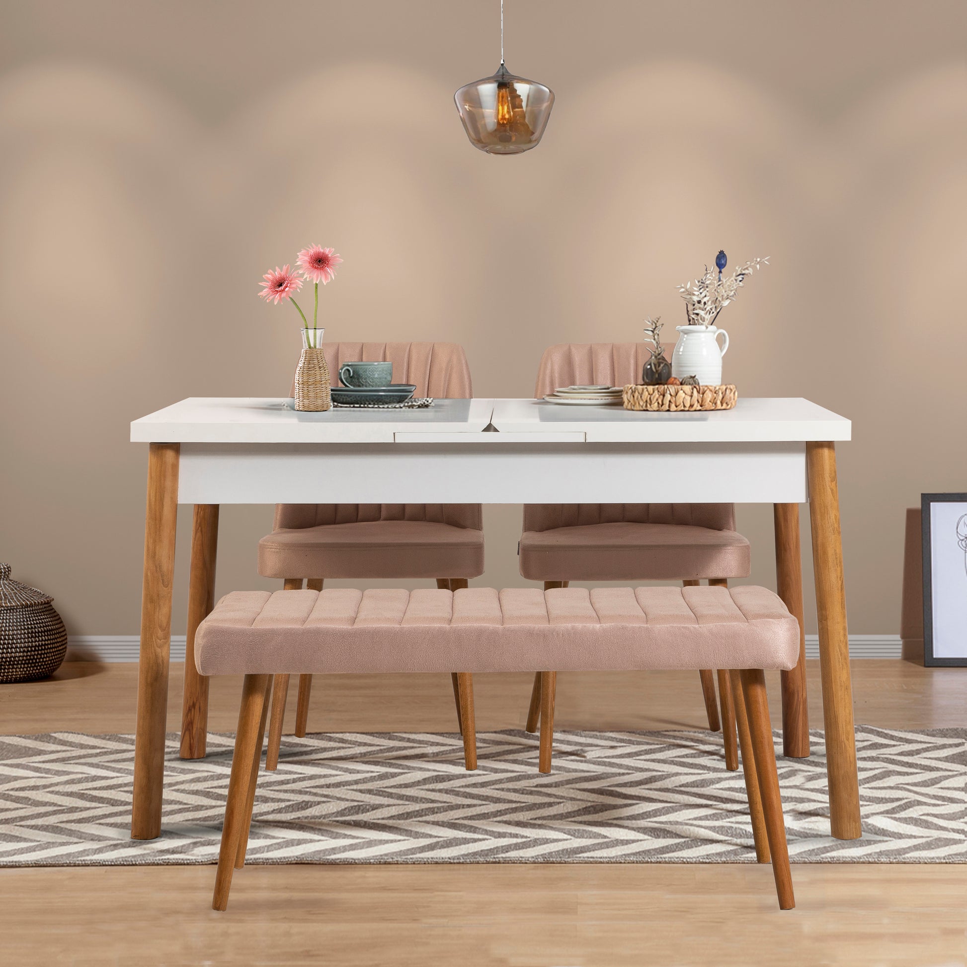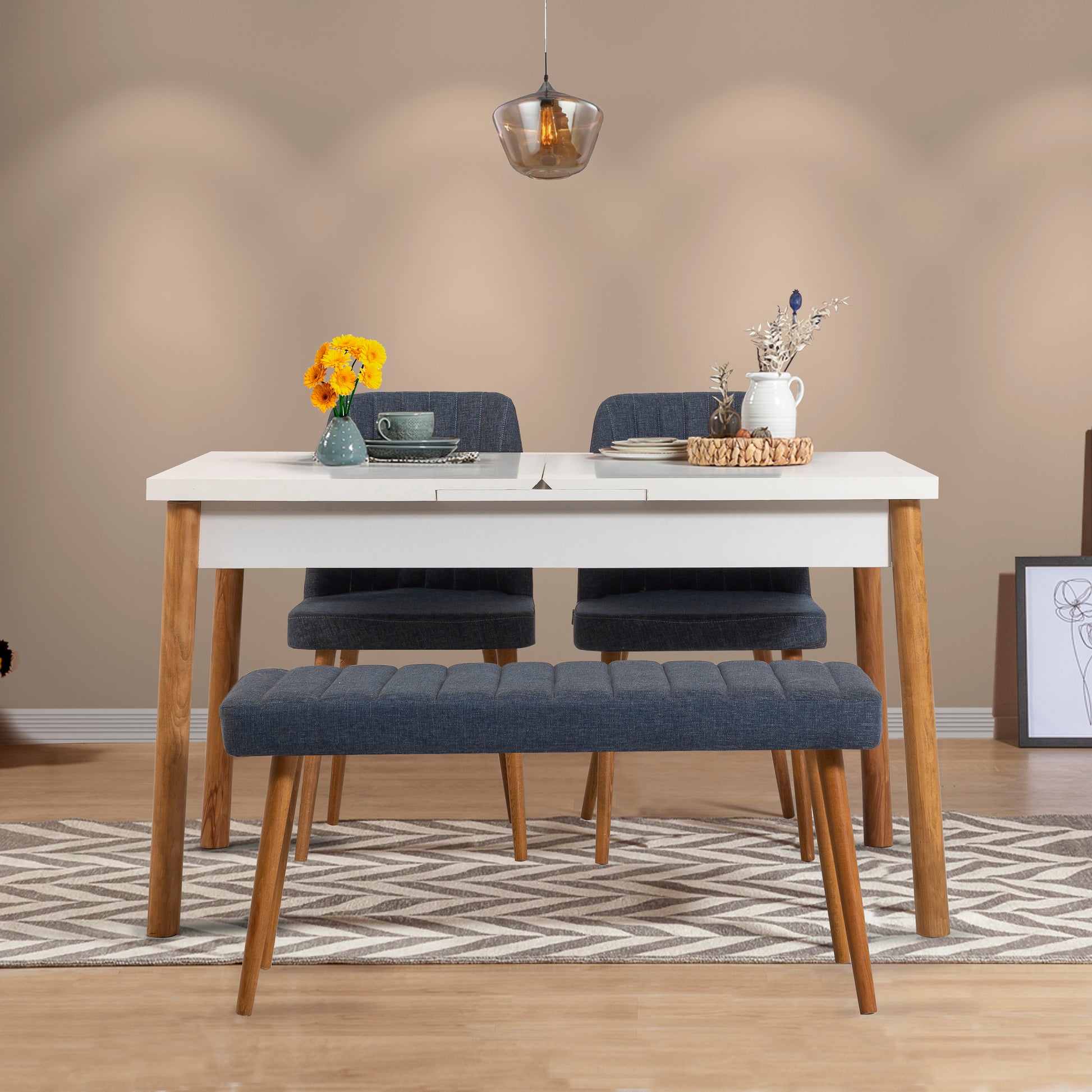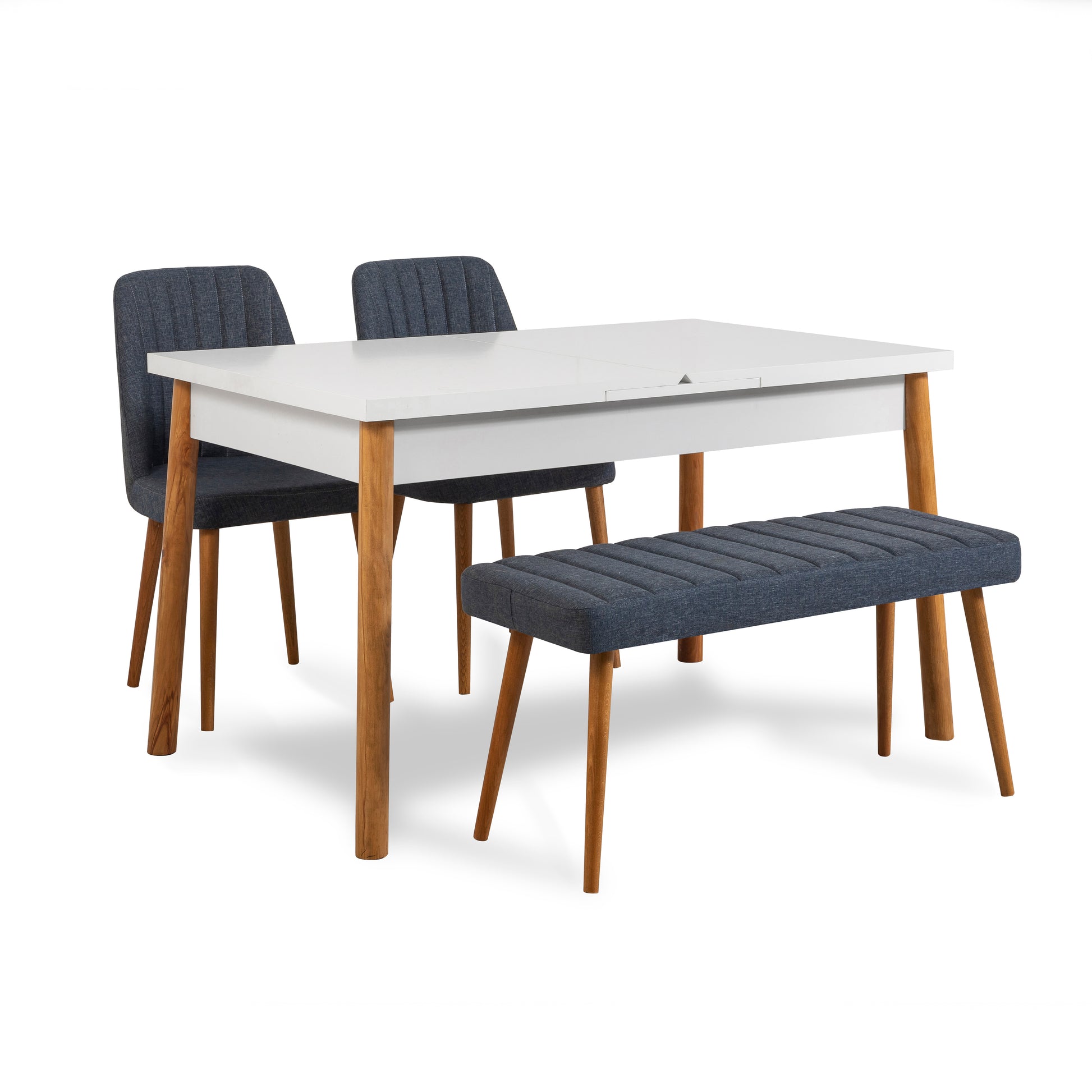 Küçük alanlarda şıklık ve işlevselliği bir araya getirir. Açılır masa ekstra kullanım alanı sunarken, keten kumaşlı sandalyeler ve bench konforlu bir oturum sağlar. Ahşap ayak detayları doğal ve zamansız bir görünüm kazandırır.