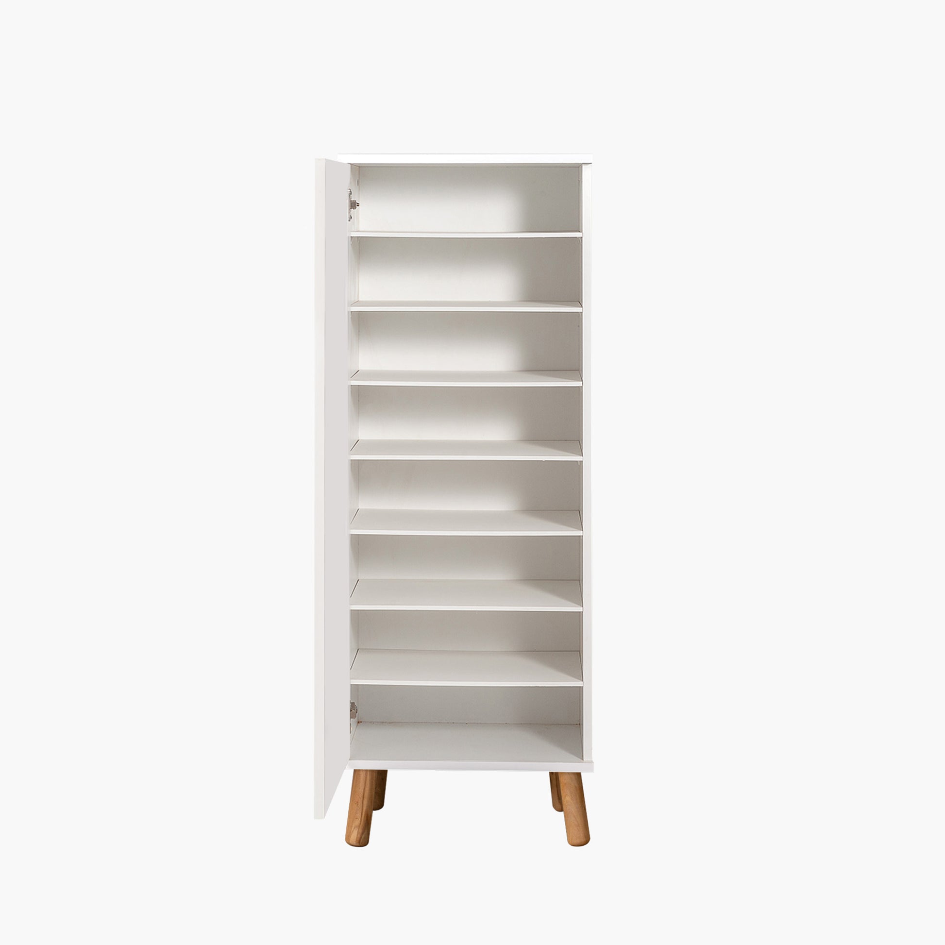 Vegas Çok Amaçlı Ayakkabılık, beyaz rengin ferahlığını masif ahşap detayların sıcaklığıyla birleştirir. 135 cm yüksekliği ve 8 adet rafıyla dar alanlarda devasa bir depolama çözümü sunar. İster antrede ayakkabılık, ister mutfakta kiler, isterseniz banyoda havluluk olarak kullanın; silindir masif ayakları ve şık kulplarıyla her odaya modern bir hava katar.