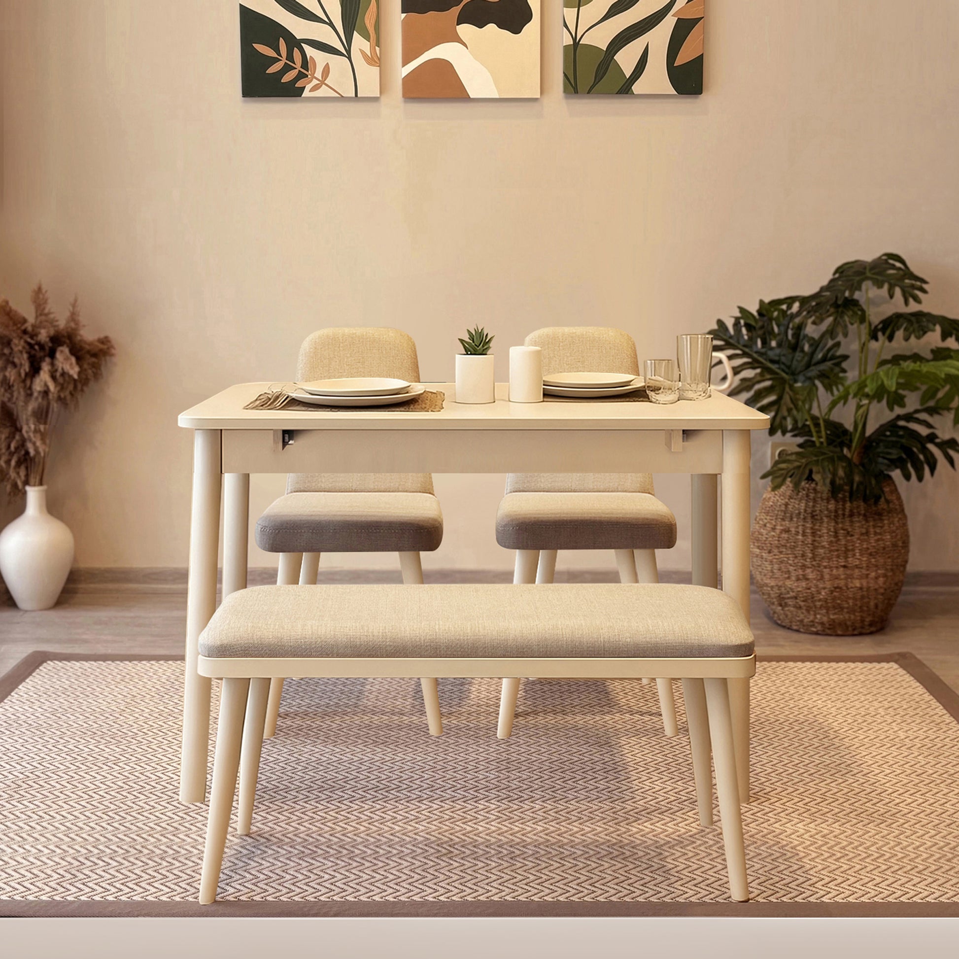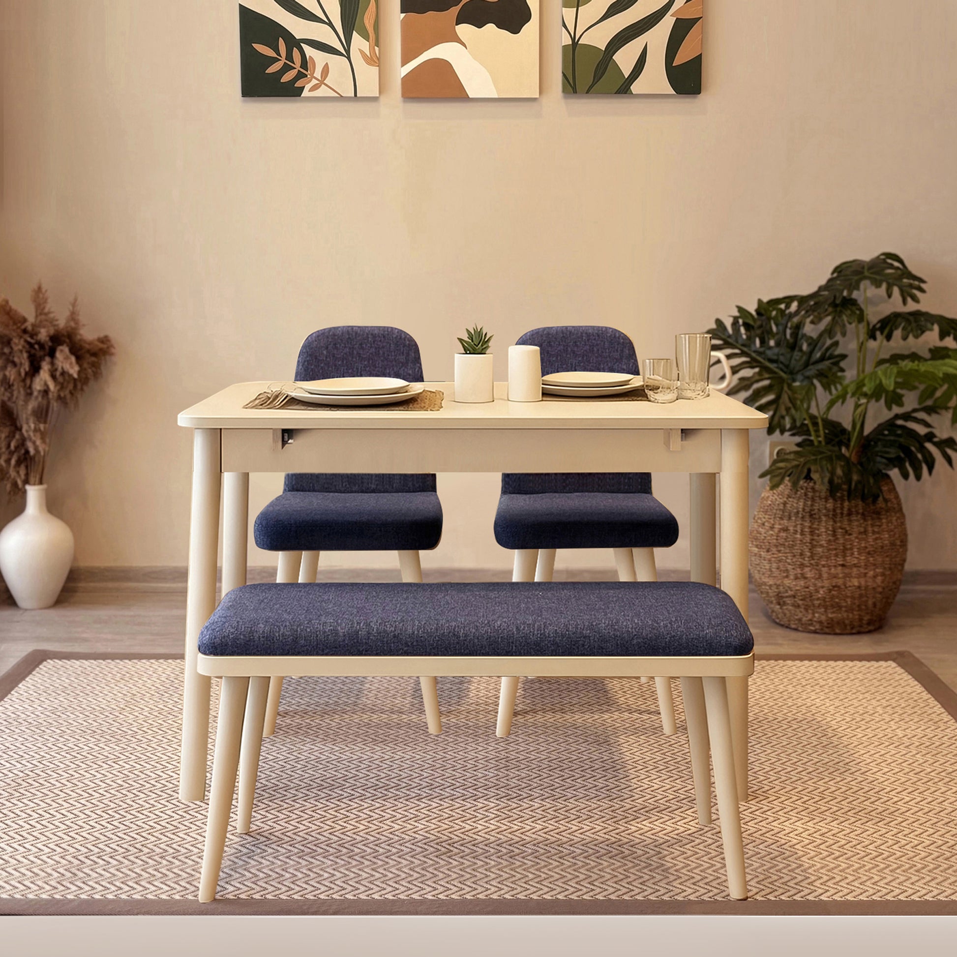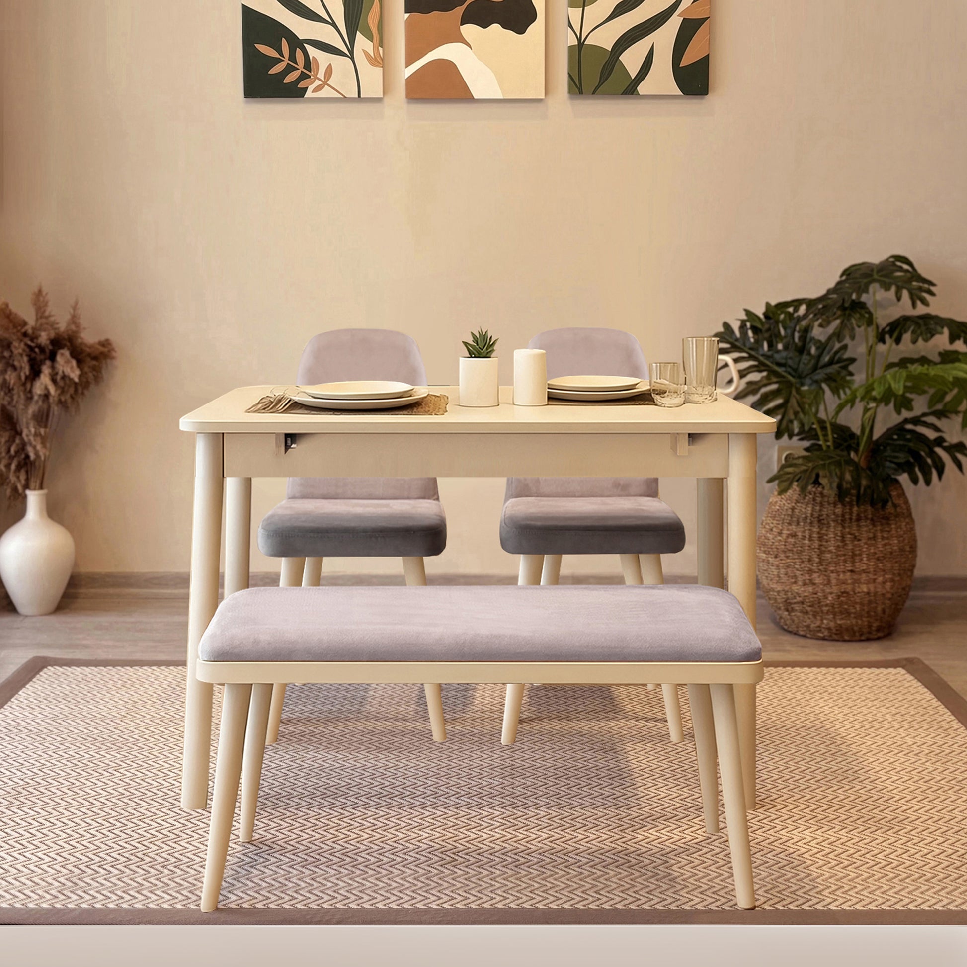 Küçük yaşam alanları için tasarlanan bu mini mutfak masa takımı, modern görünümü ve pratik yapısıyla günlük kullanıma uyum sağlar. 1 masa + 2 sandalye + 1 bench içeriğiyle kompakt bir çözüm sunar ve farklı dekorasyon stillerine kolayca eşlik eder.