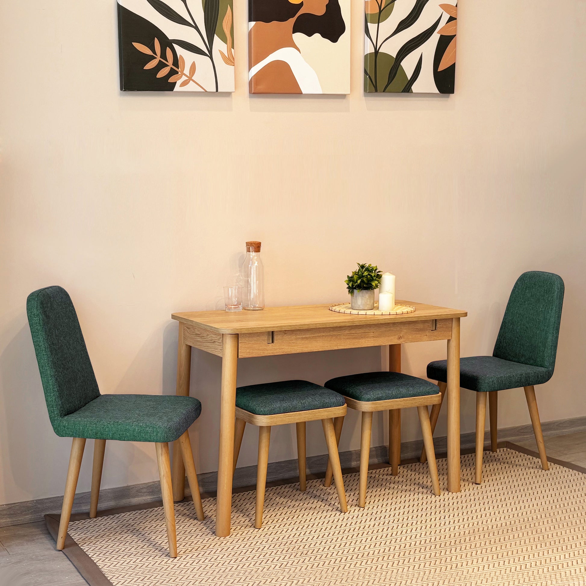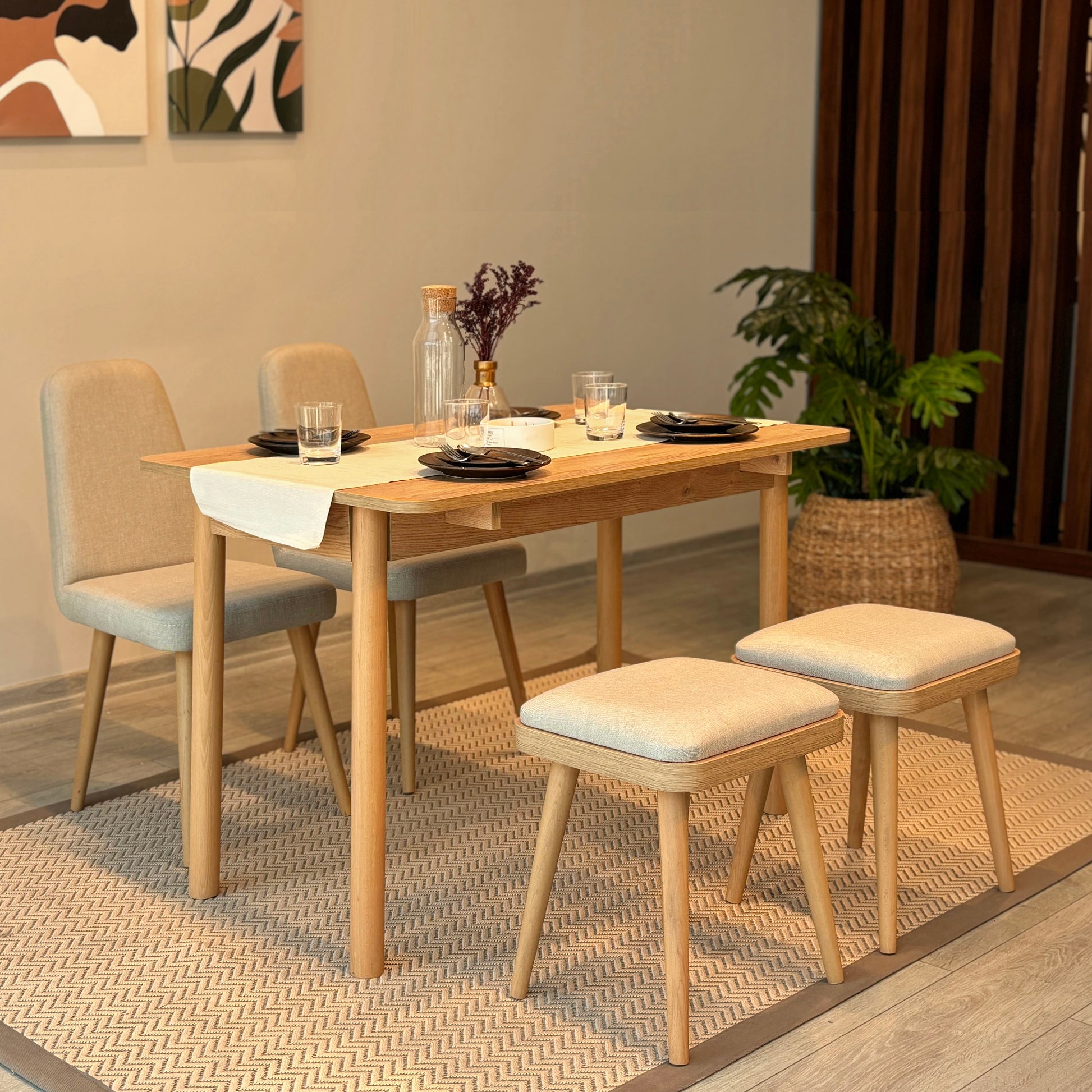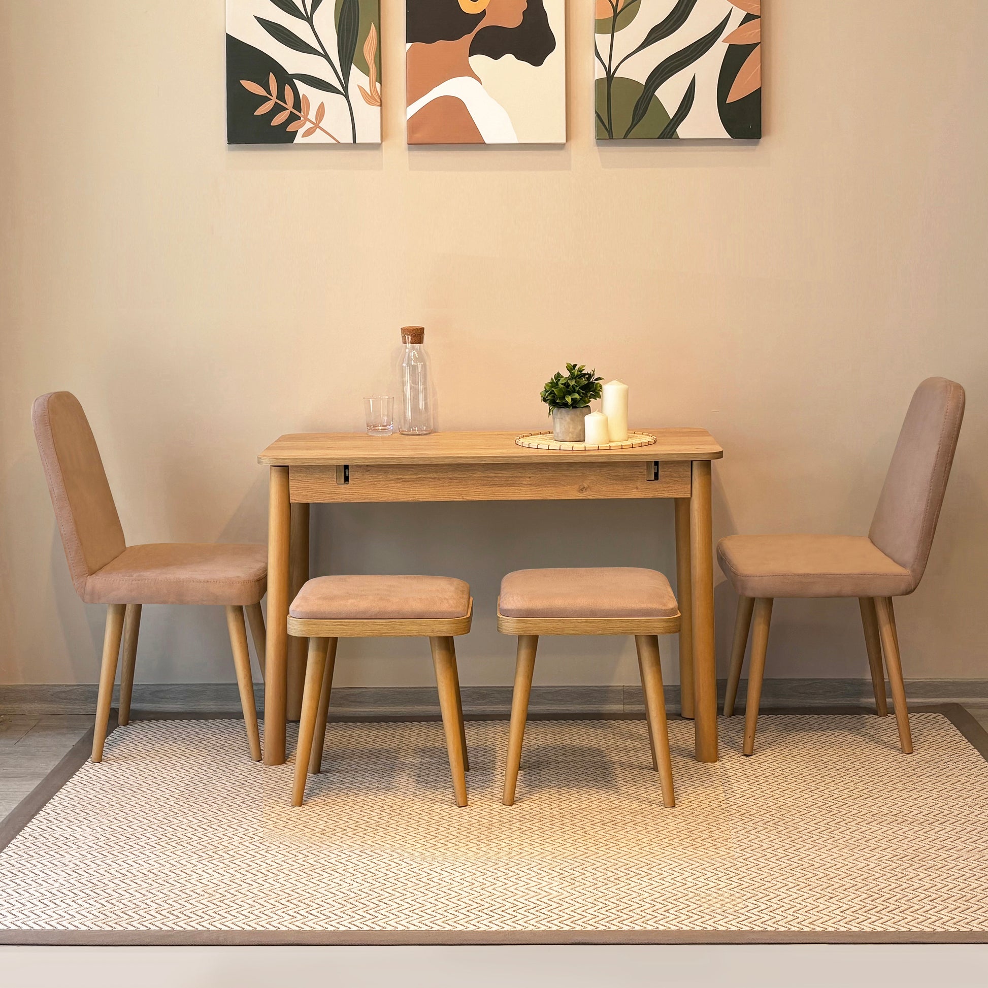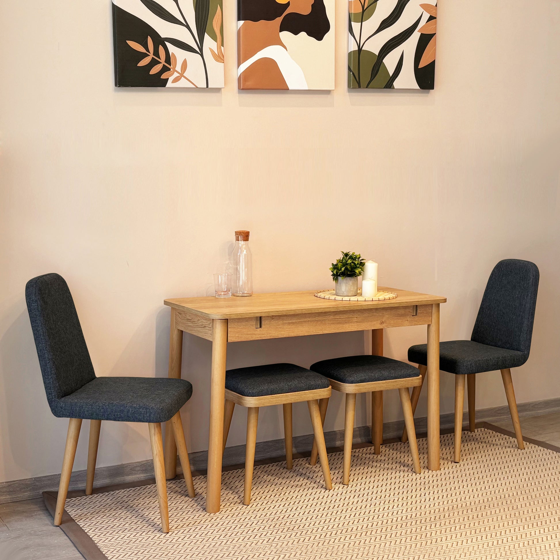 Küçük yaşam alanları için tasarlanan bu mini mutfak masa takımı, modern görünümü ve pratik kullanımıyla günlük yaşama kolaylık sağlar. 1 masa + 2 sandalye + 2 tabure içeriğiyle kompakt bir çözüm sunar ve farklı dekorasyon stillerine uyum sağlar.