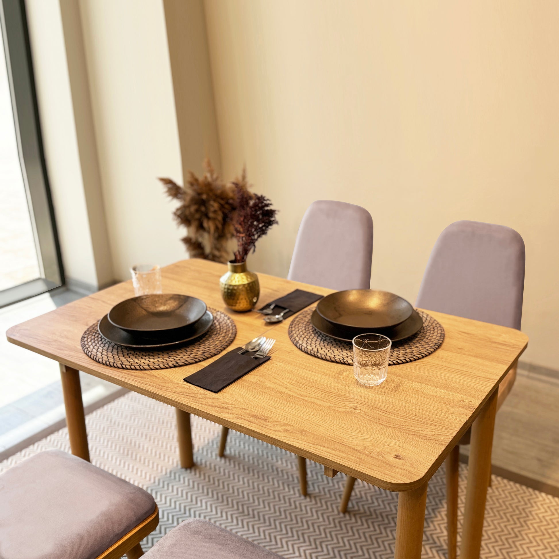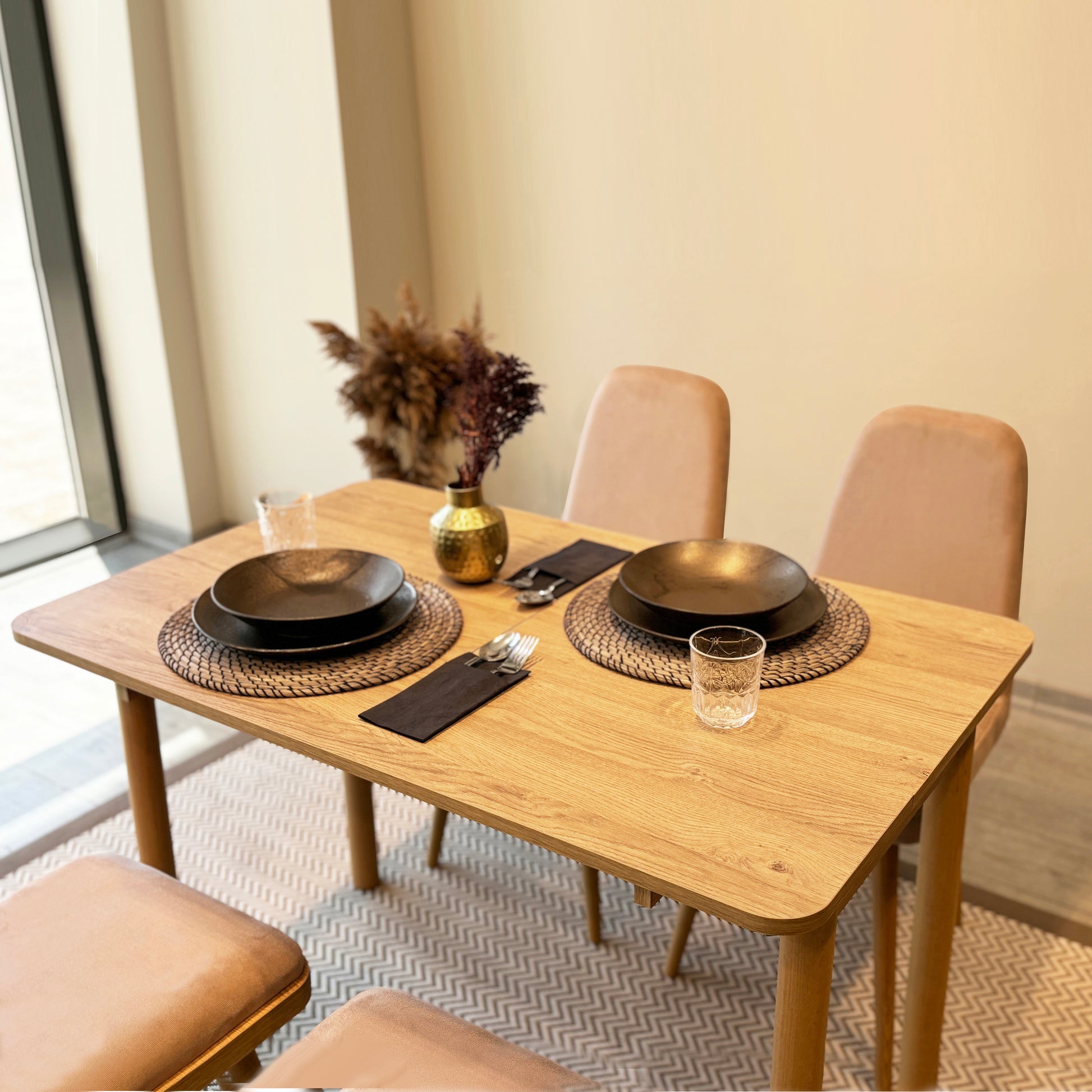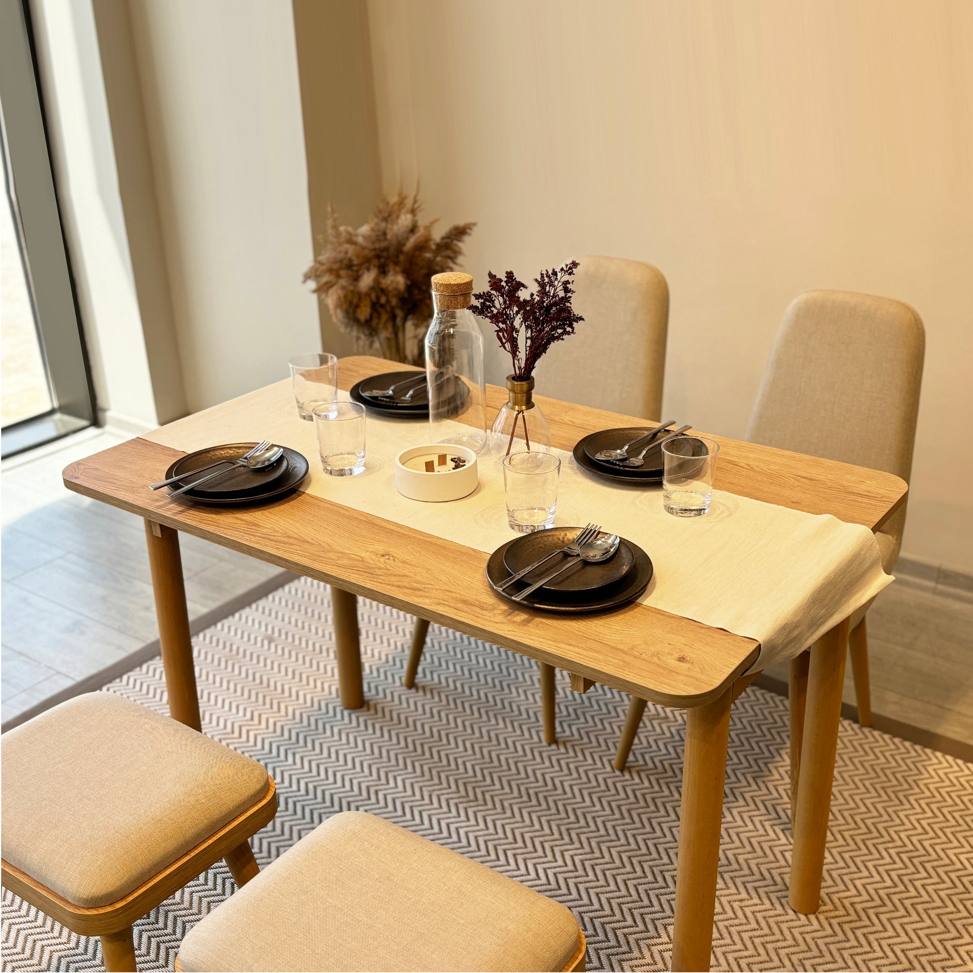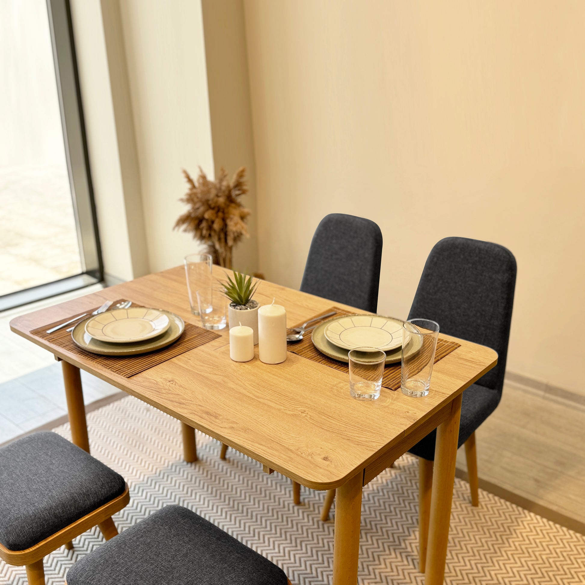 Küçük yaşam alanları için tasarlanan bu mini mutfak masa takımı, modern görünümü ve pratik kullanımıyla günlük yaşama kolaylık sağlar. 1 masa + 2 sandalye + 2 tabure içeriğiyle kompakt bir çözüm sunar ve farklı dekorasyon stillerine uyum sağlar.