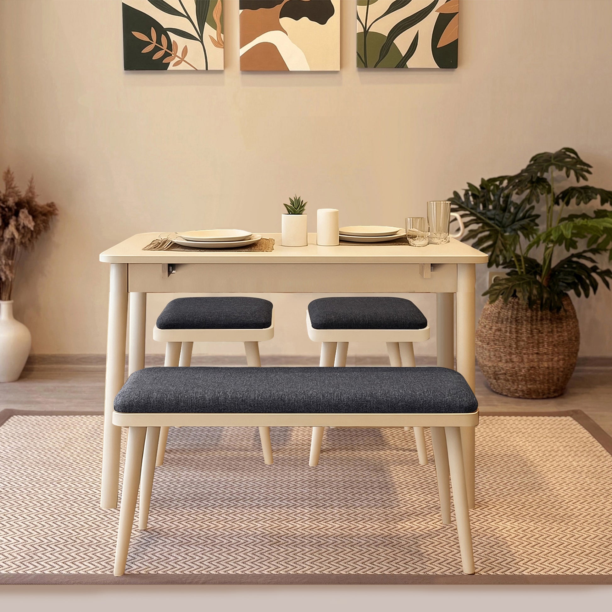 Küçük alanlarda şıklık ve işlevselliği bir araya getirir. Açılır masa ekstra kullanım alanı sunarken, keten kumaşlı sandalyeler ve bench konforlu bir oturum sağlar. Ahşap ayak detayları doğal ve zamansız bir görünüm kazandırır.