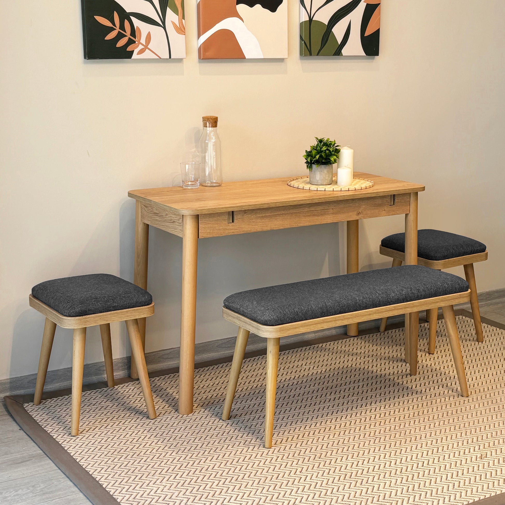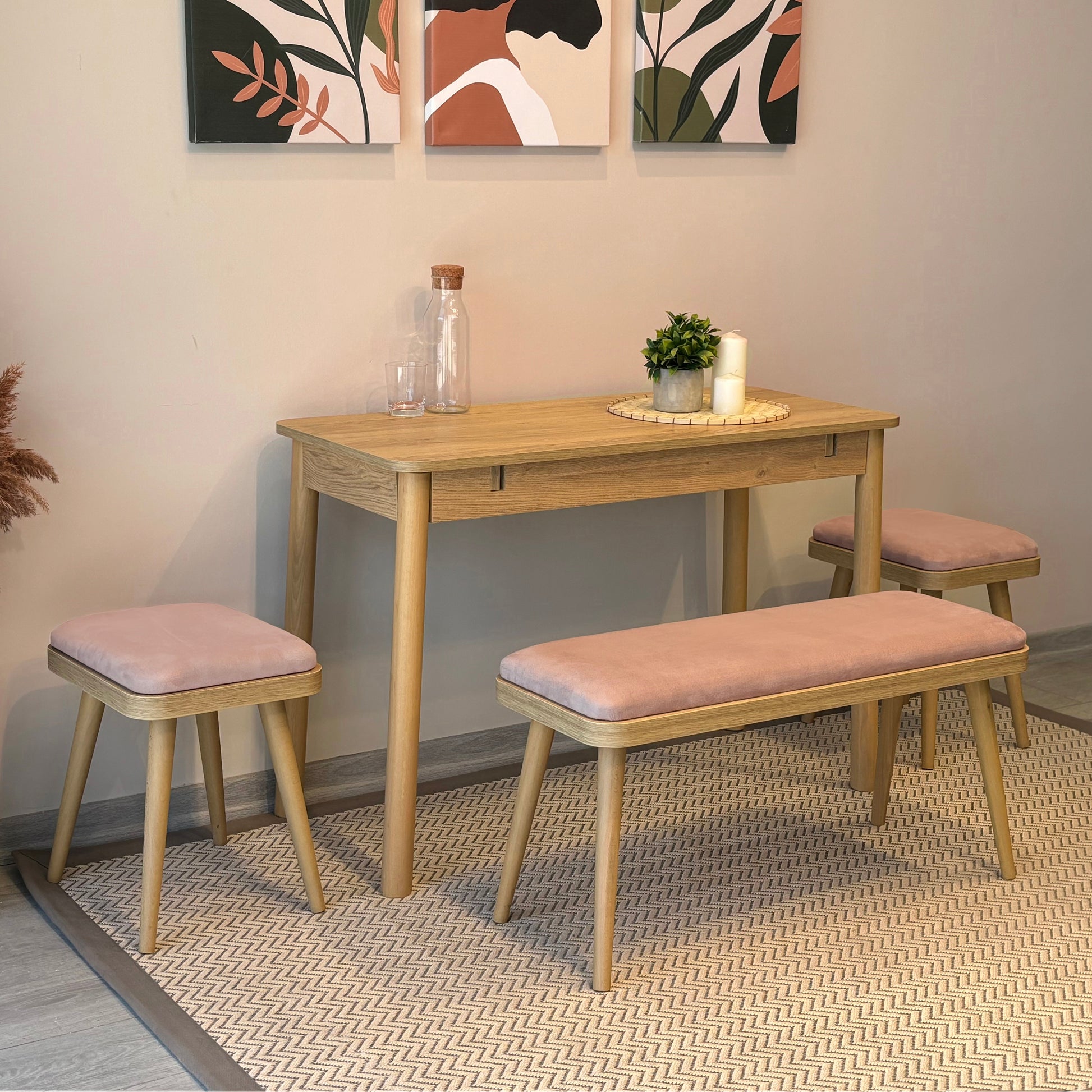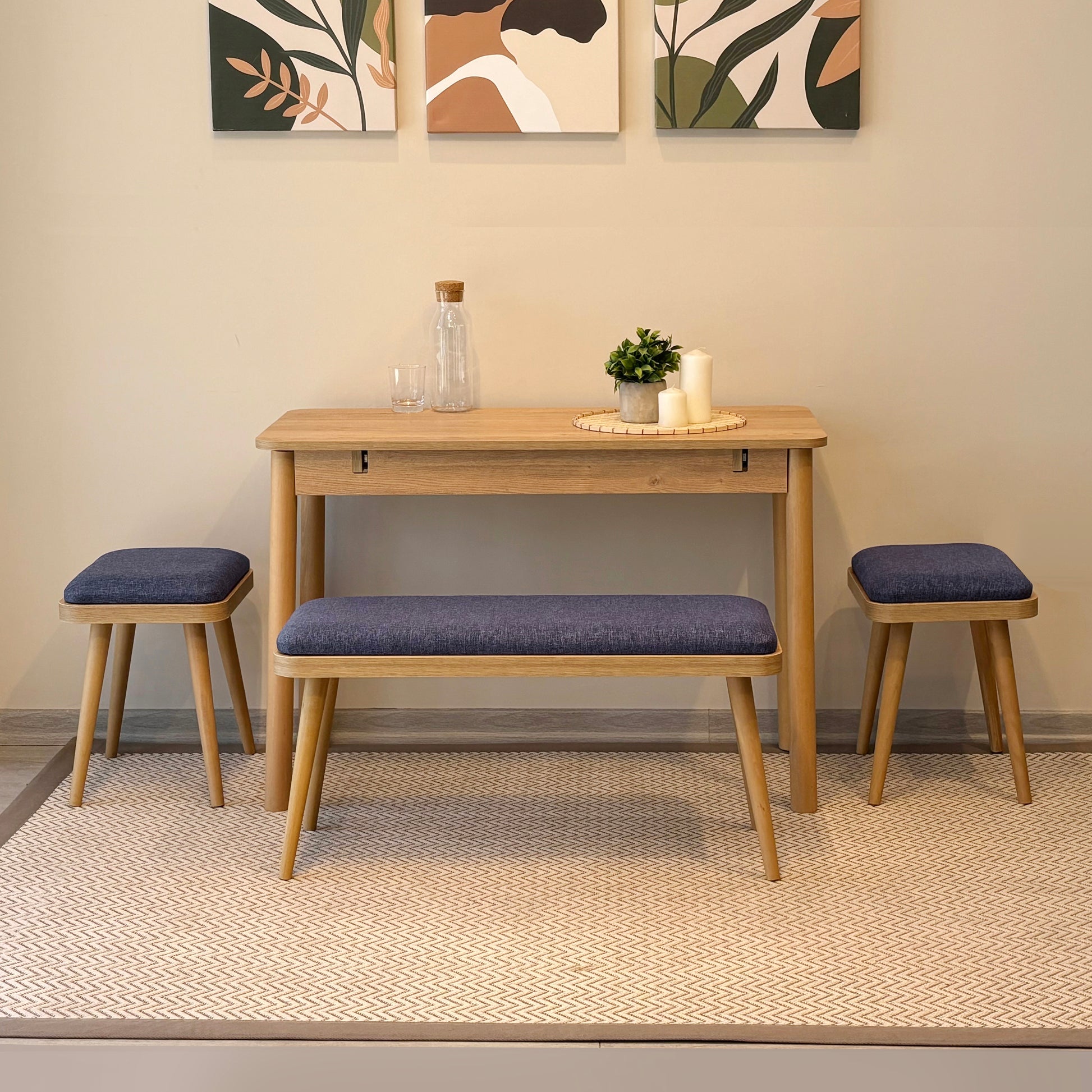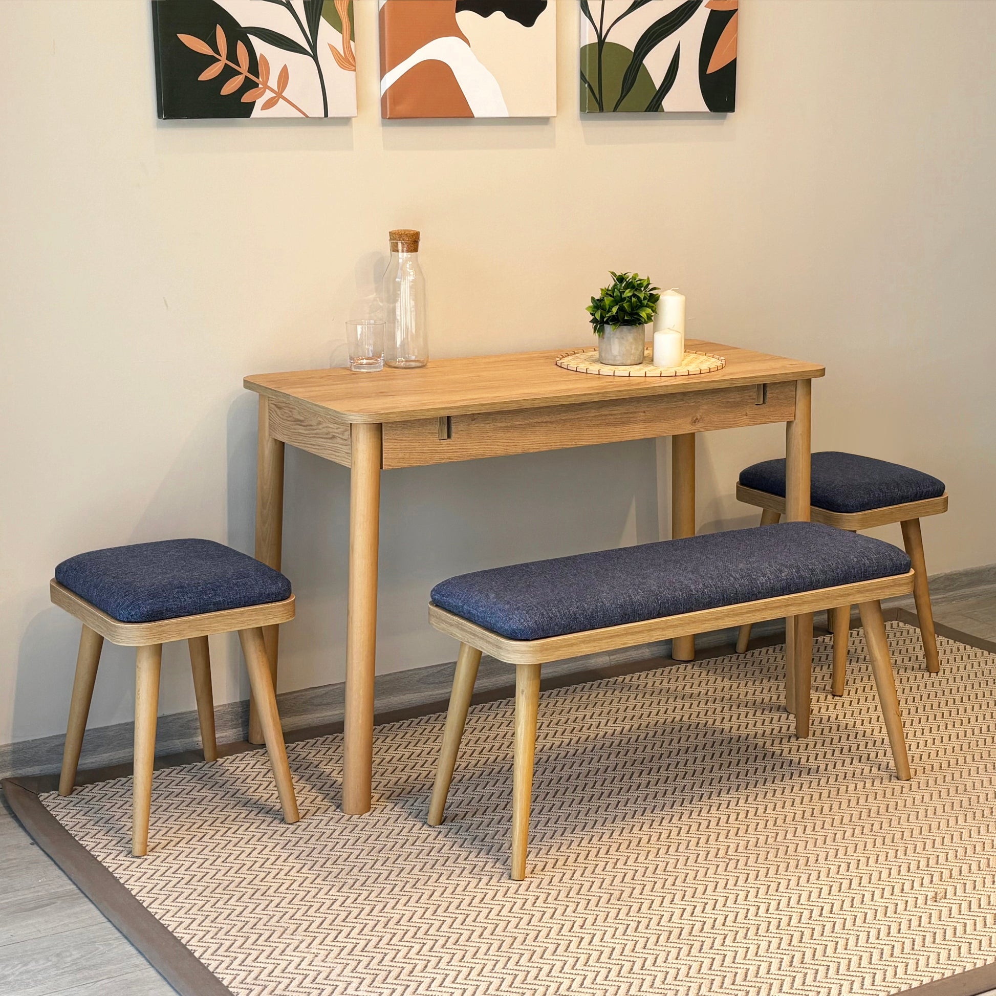 Küçük yaşam alanları için tasarlanan bu mini mutfak masa takımı, modern görünümü ve pratik kullanımıyla günlük yaşama kolaylık sağlar. 1 Masa + 2 Tabure + 1 Bench içeriğiyle geniş ve kompakt bir çözüm sunar ve farklı dekorasyon stillerine uyum sağlar.