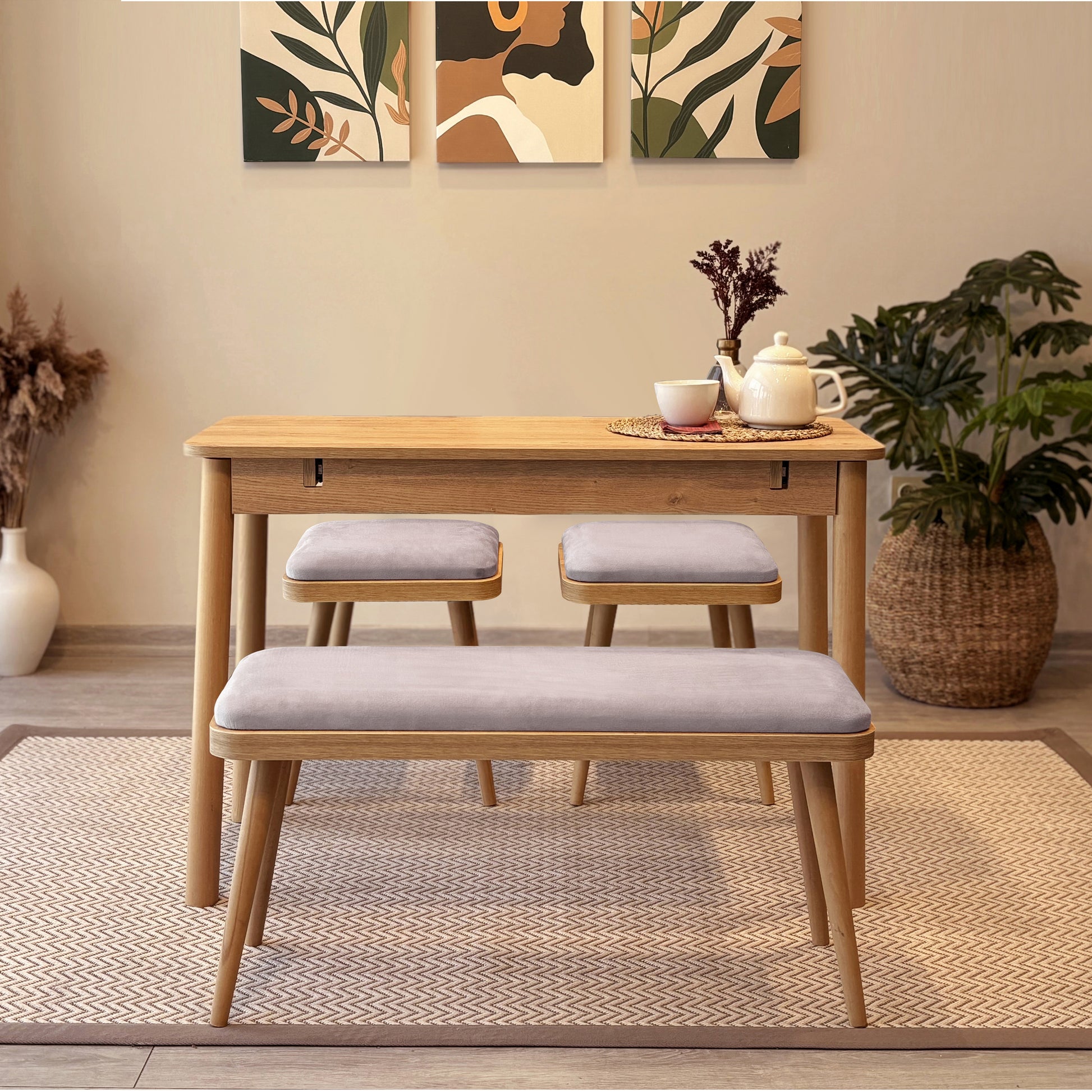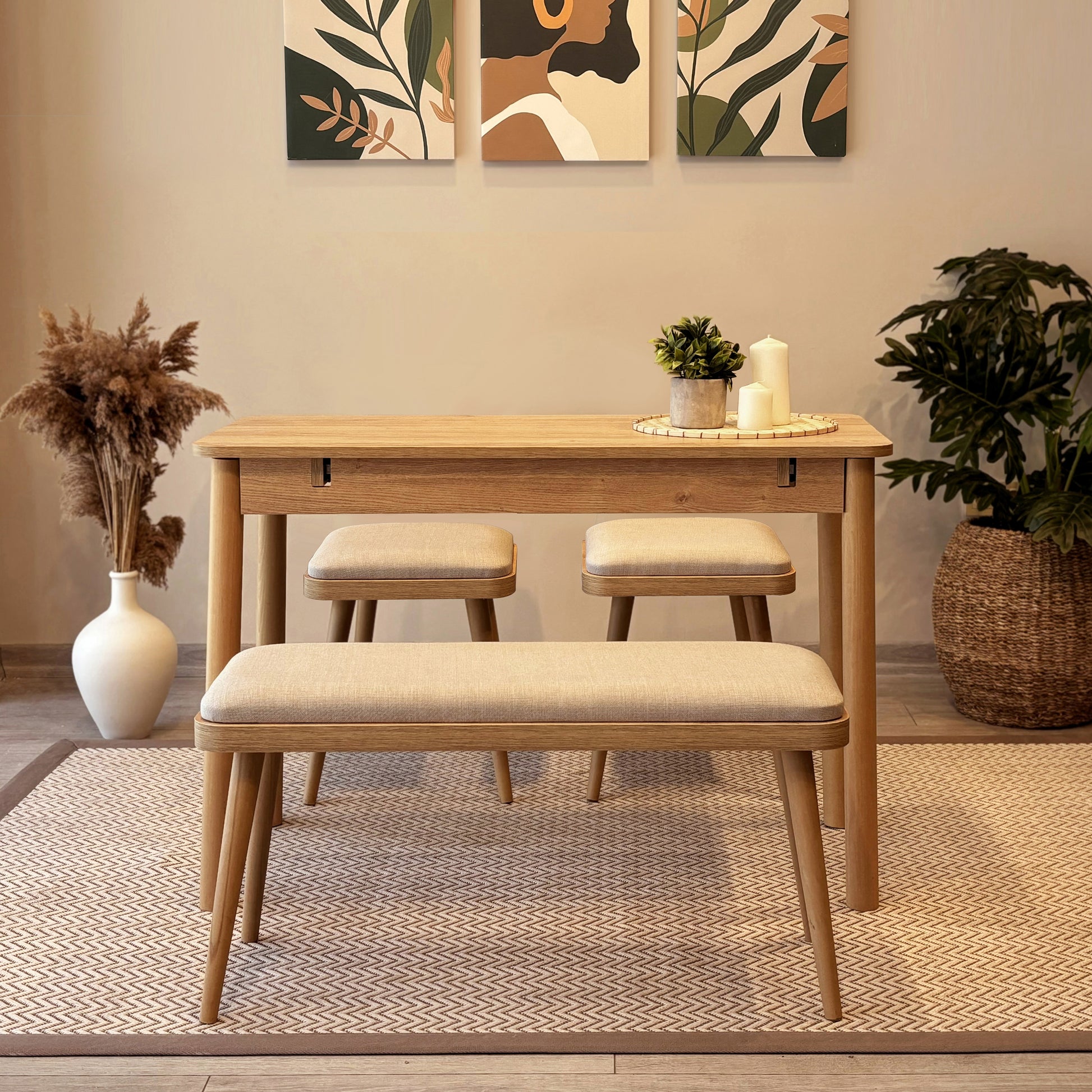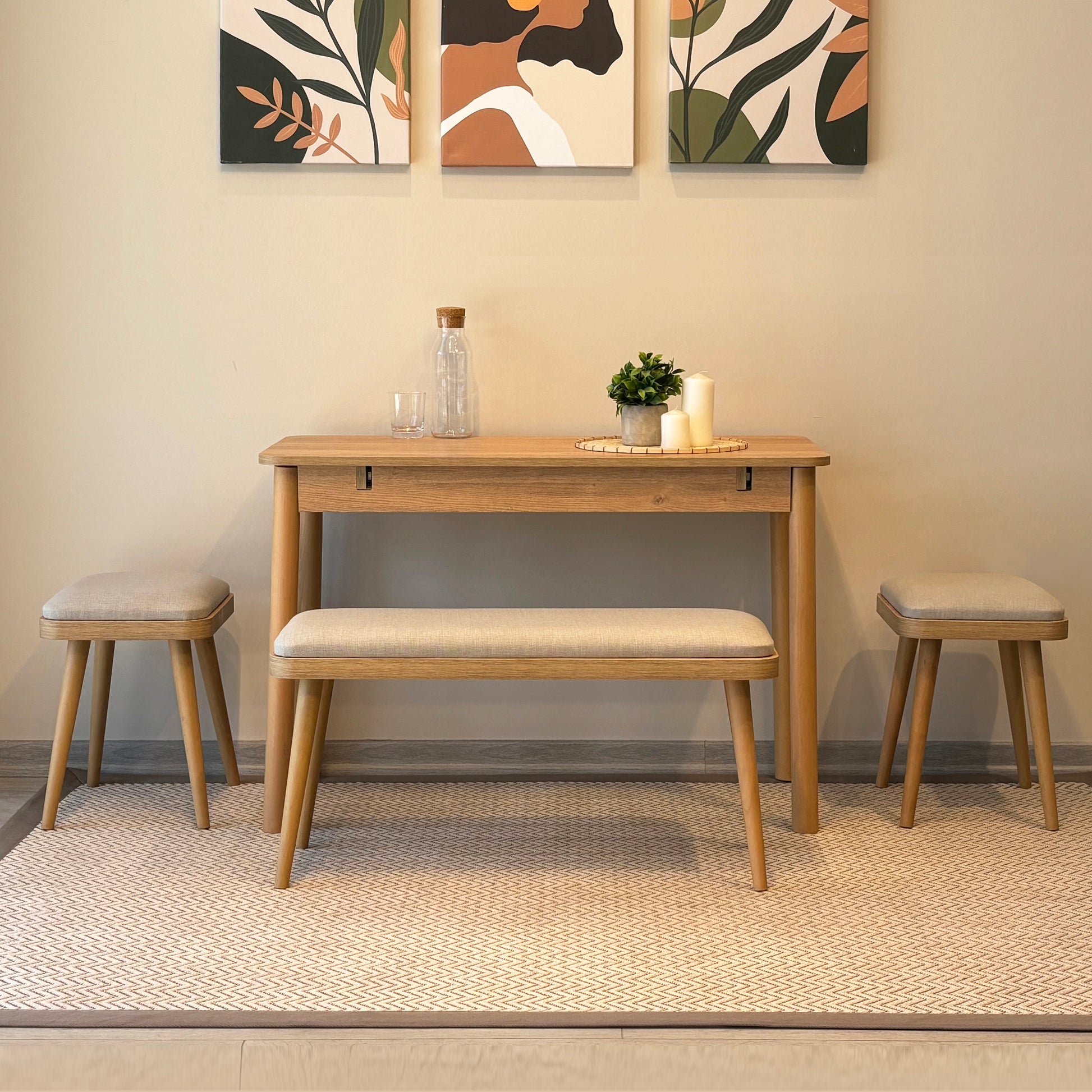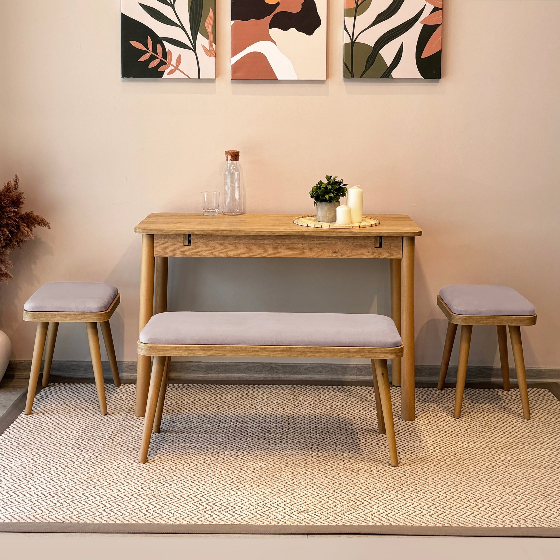 Küçük yaşam alanları için tasarlanan bu mini mutfak masa takımı, modern görünümü ve pratik kullanımıyla günlük yaşama kolaylık sağlar. 1 Masa + 2 Tabure + 1 Bench içeriğiyle geniş ve kompakt bir çözüm sunar ve farklı dekorasyon stillerine uyum sağlar.