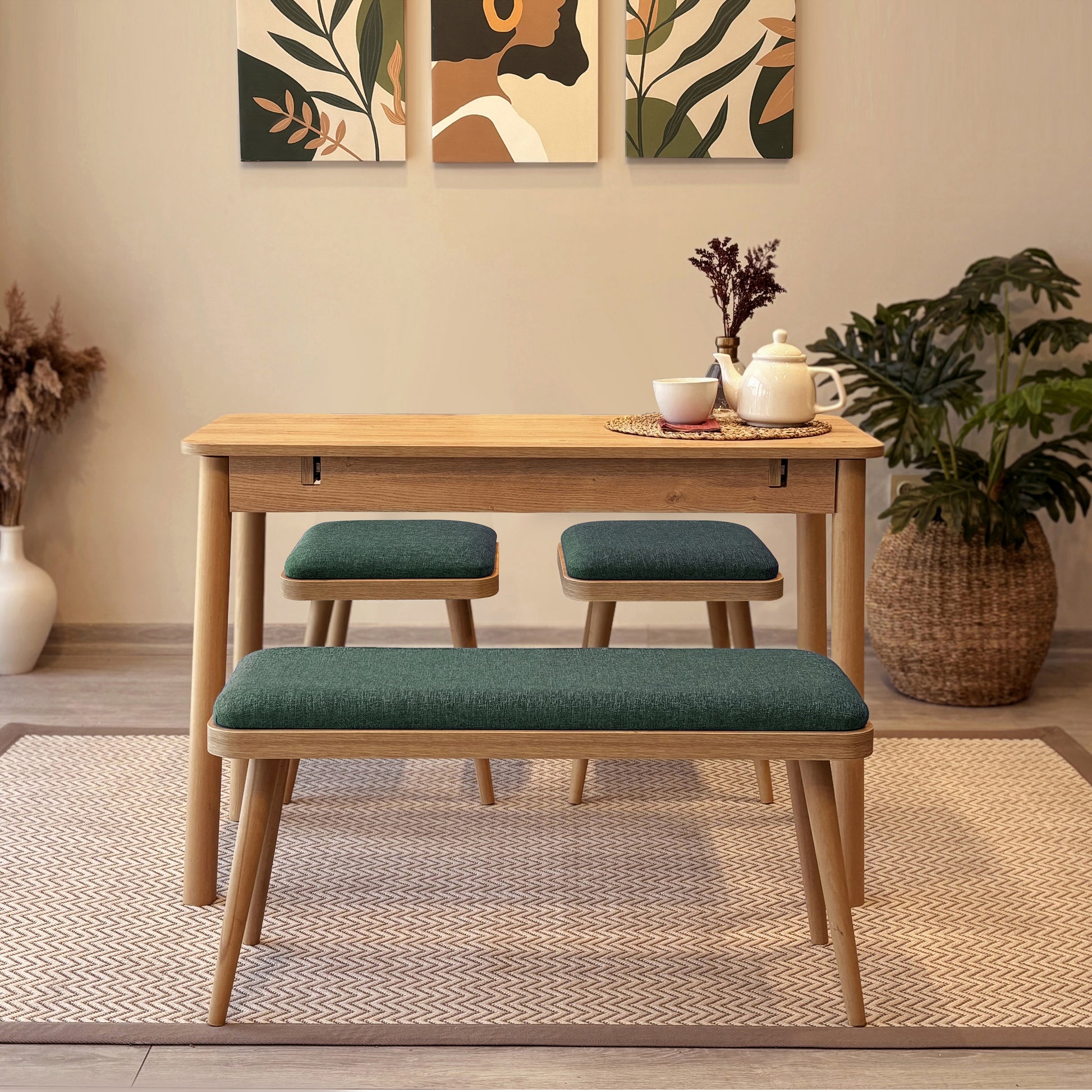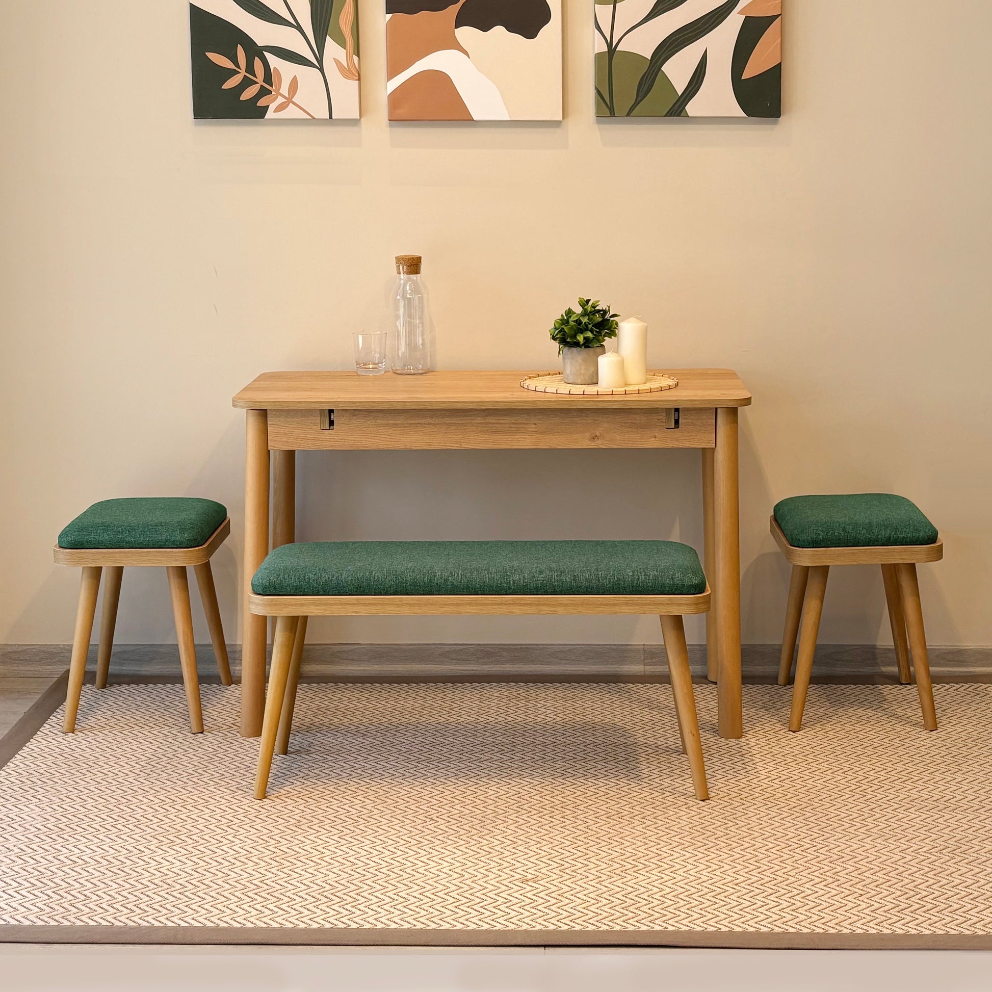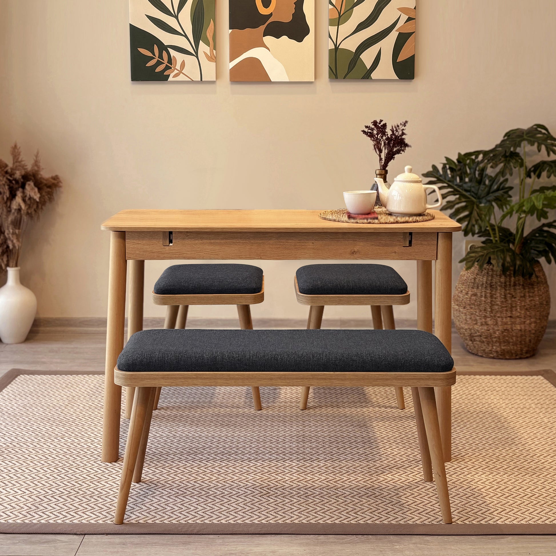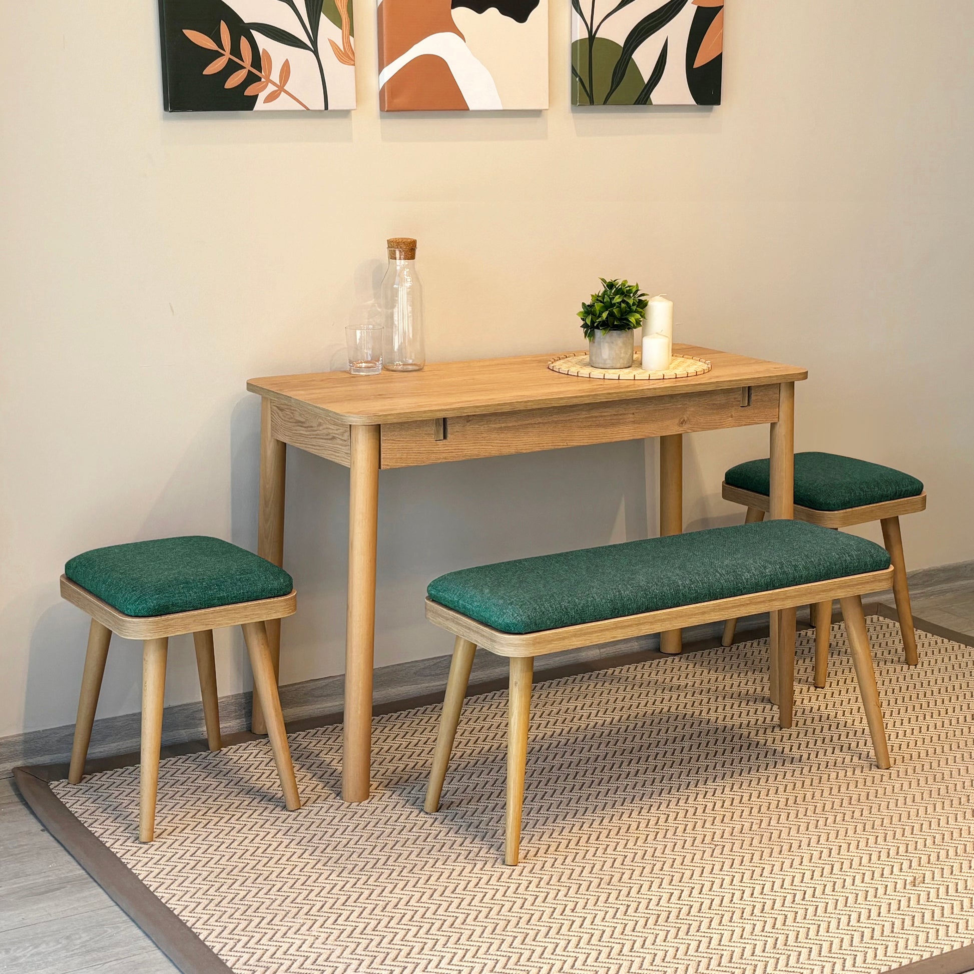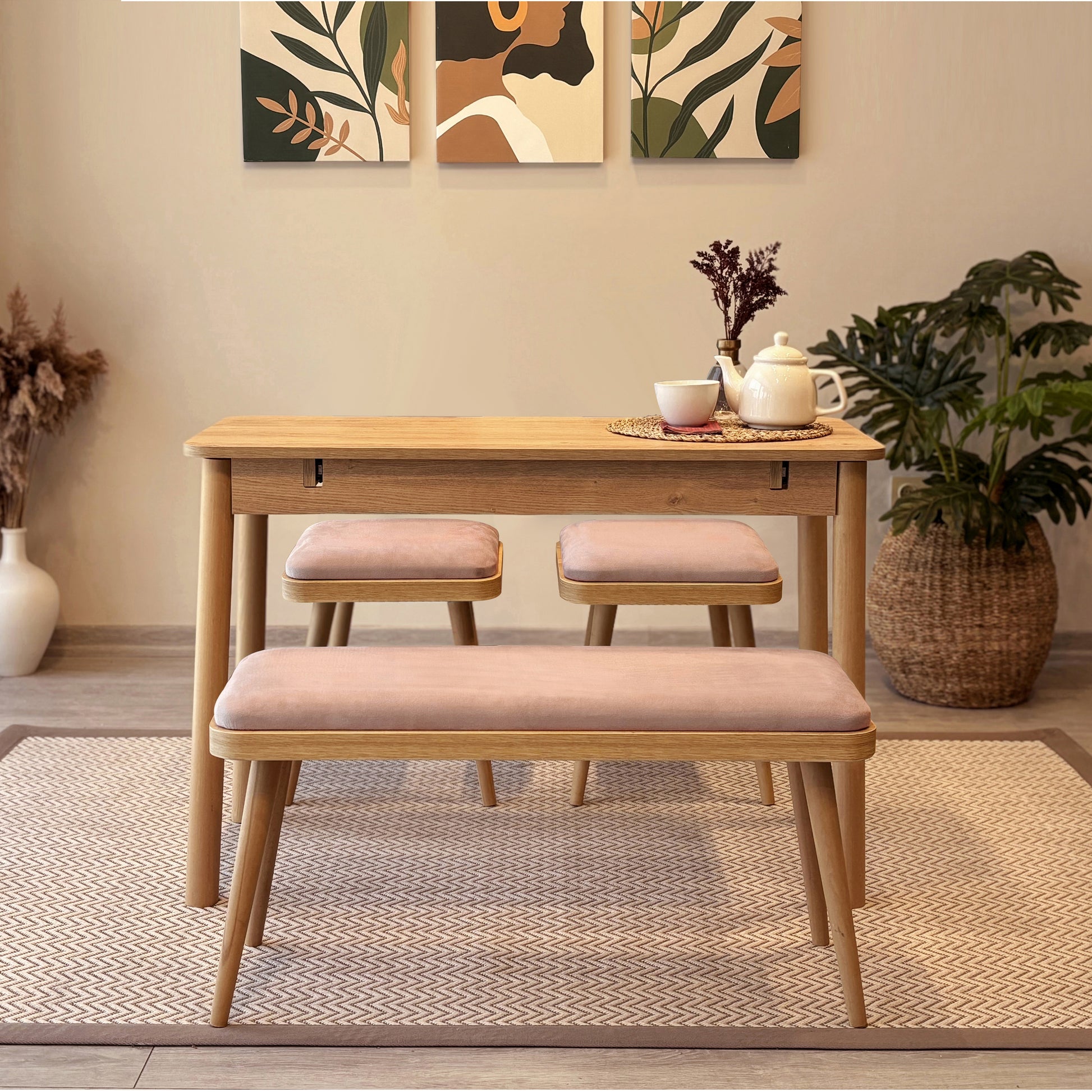 Küçük yaşam alanları için tasarlanan bu mini mutfak masa takımı, modern görünümü ve pratik kullanımıyla günlük yaşama kolaylık sağlar. 1 Masa + 2 Tabure + 1 Bench içeriğiyle geniş ve kompakt bir çözüm sunar ve farklı dekorasyon stillerine uyum sağlar.