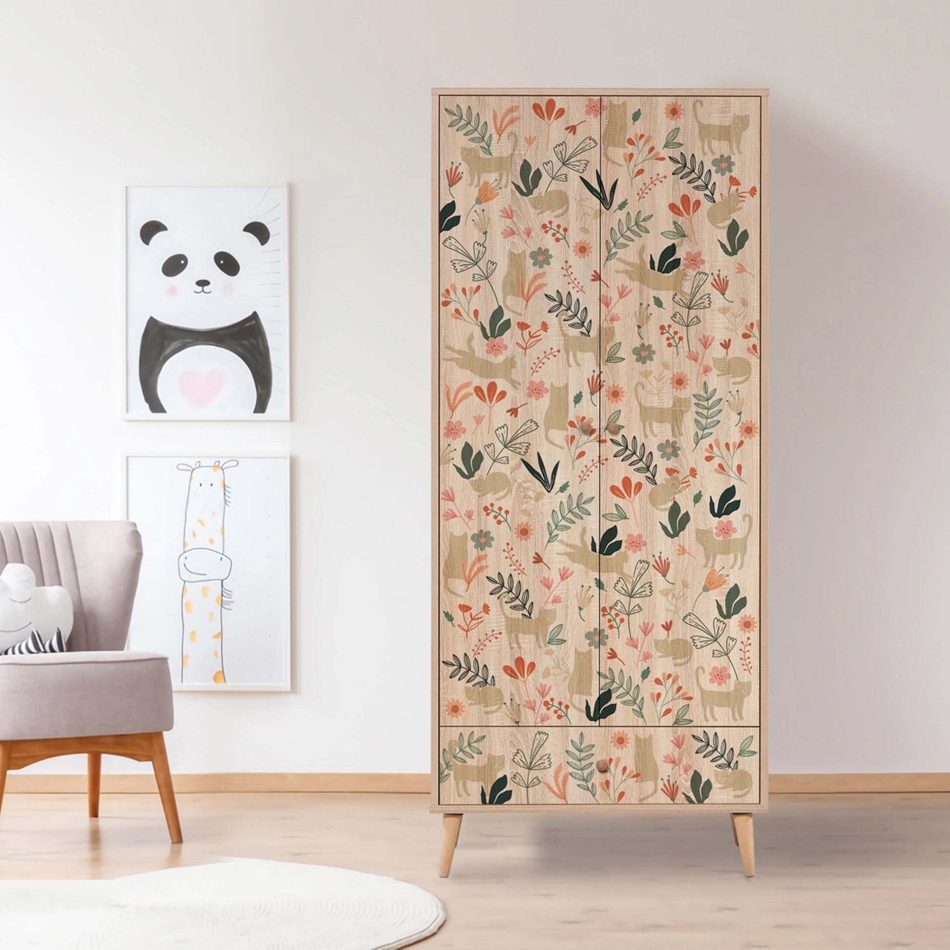City Sonomo Desenli Gardırop, yatak odanıza veya genç odanıza sanatsal bir dokunuş katar. 80 cm genişliği ve 190 cm yüksekliği ile kompakt ama hacimli bir depolama sunar. Kapaklarında kullanılan özel UV dijital baskı teknolojisi ile desenlendirilmiş olup, Art serisinin imzası olan masif konik ahşap ayaklarla tamamlanmıştır. Geniş askılık alanı ve raf düzeniyle kıyafetlerinizi düzenli tutar.