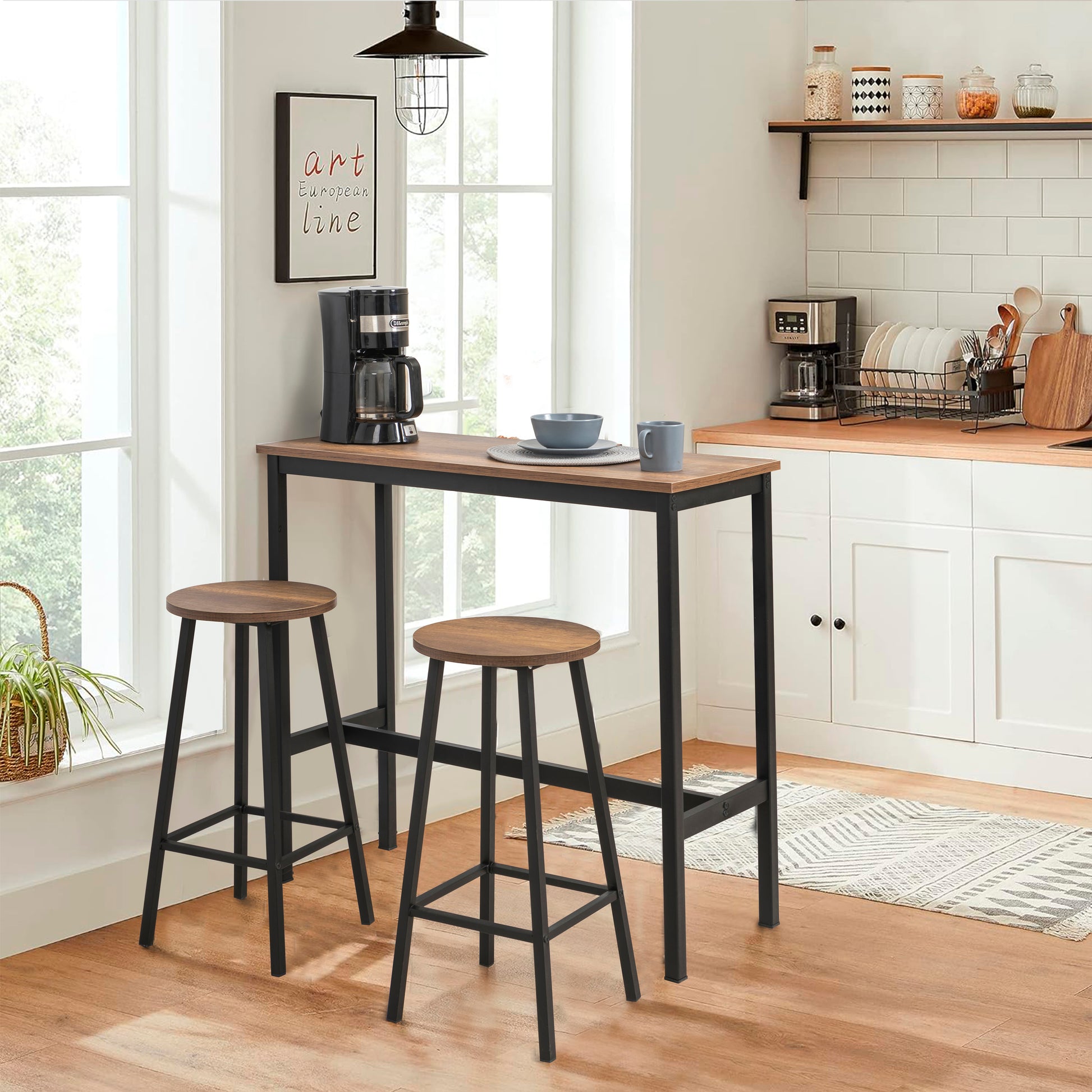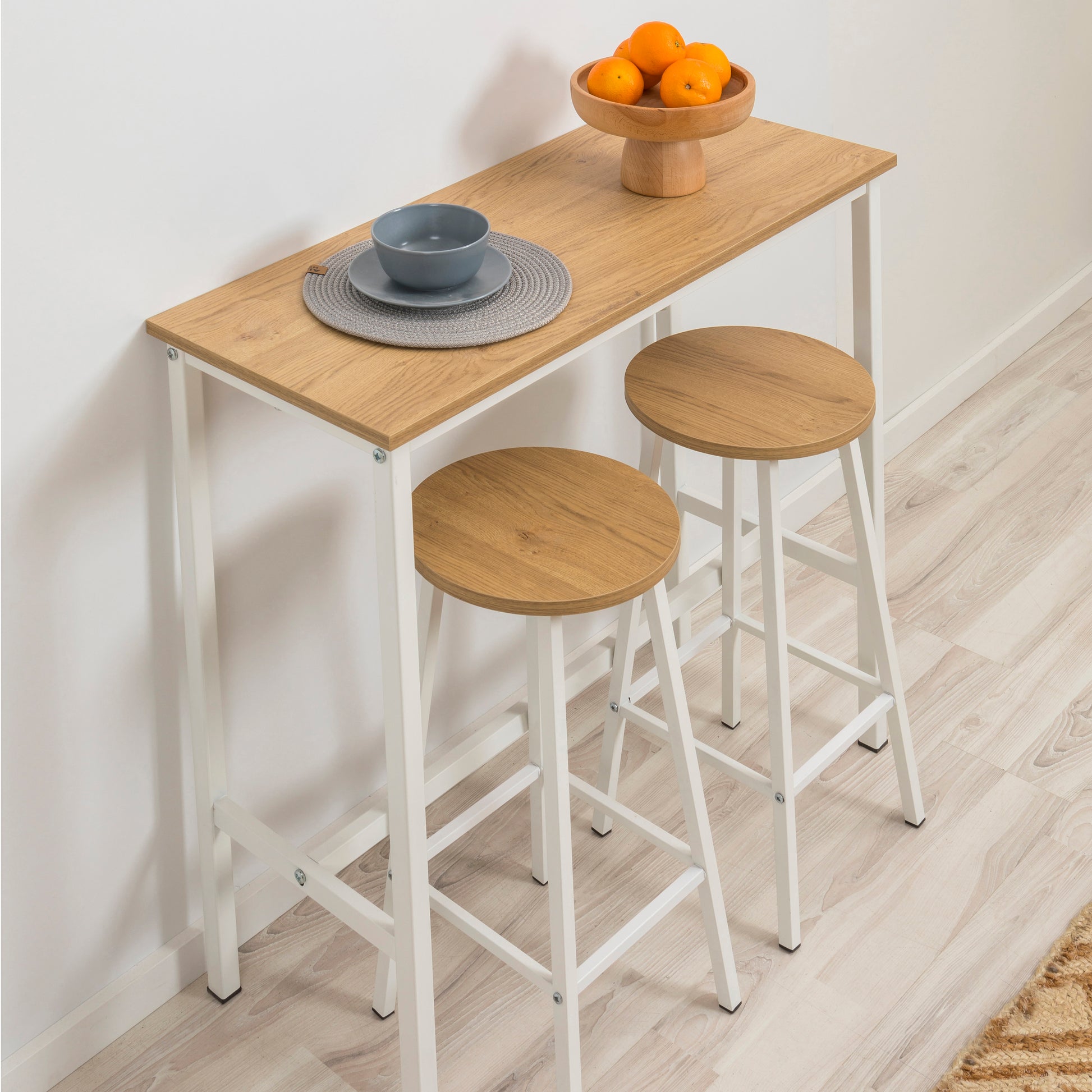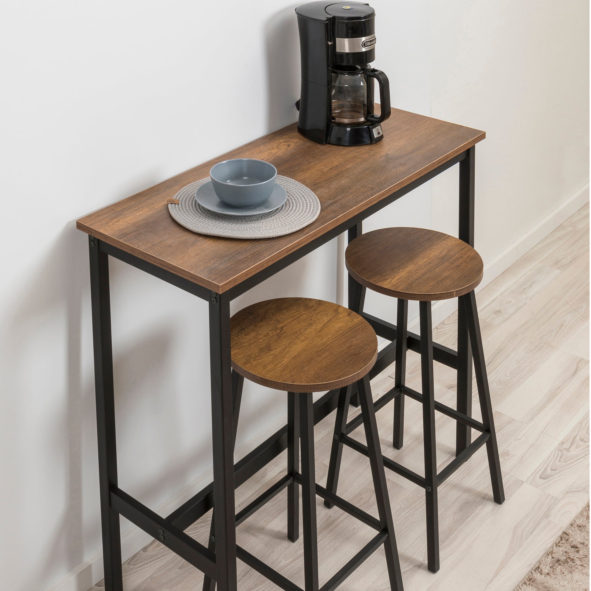 Mola Bar Masası Takımı, Barok Ceviz renginin şıklığını kompakt bir bar konseptiyle buluşturur. 1 Bar Masası + 2 Tabure içeriğiyle dar mutfaklar ve balkonlar için mükemmel bir keyif köşesi yaratır. 100 cm yüksekliğindeki masası ve modern tasarımıyla yaşam alanınıza dinamik bir hava katar.