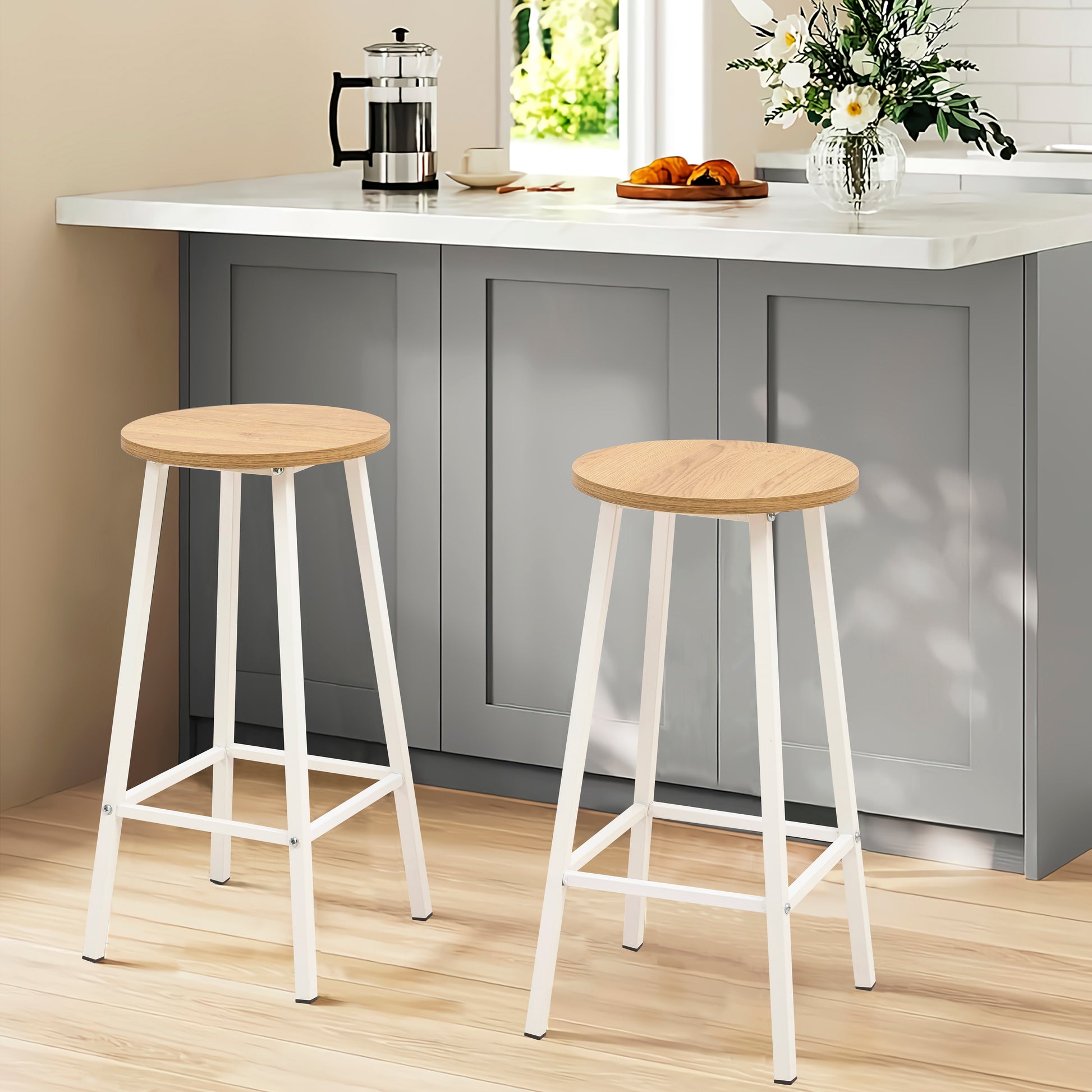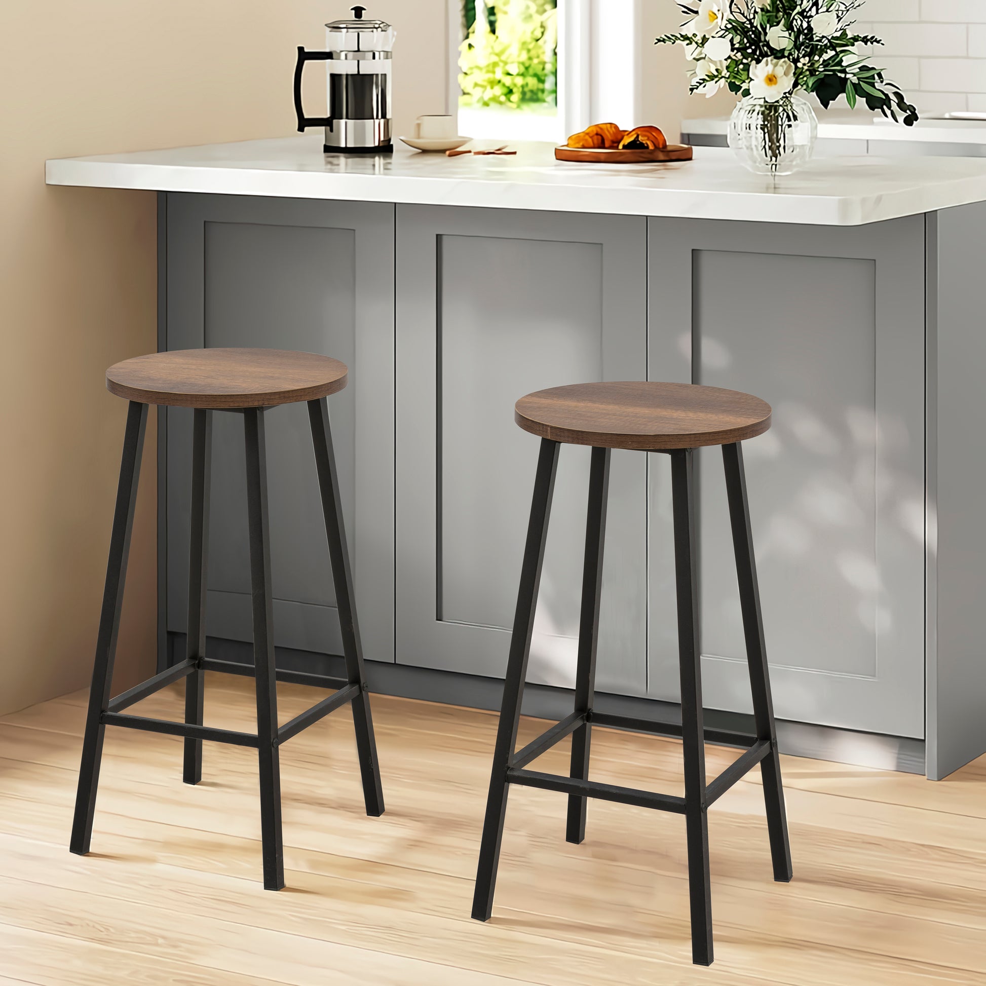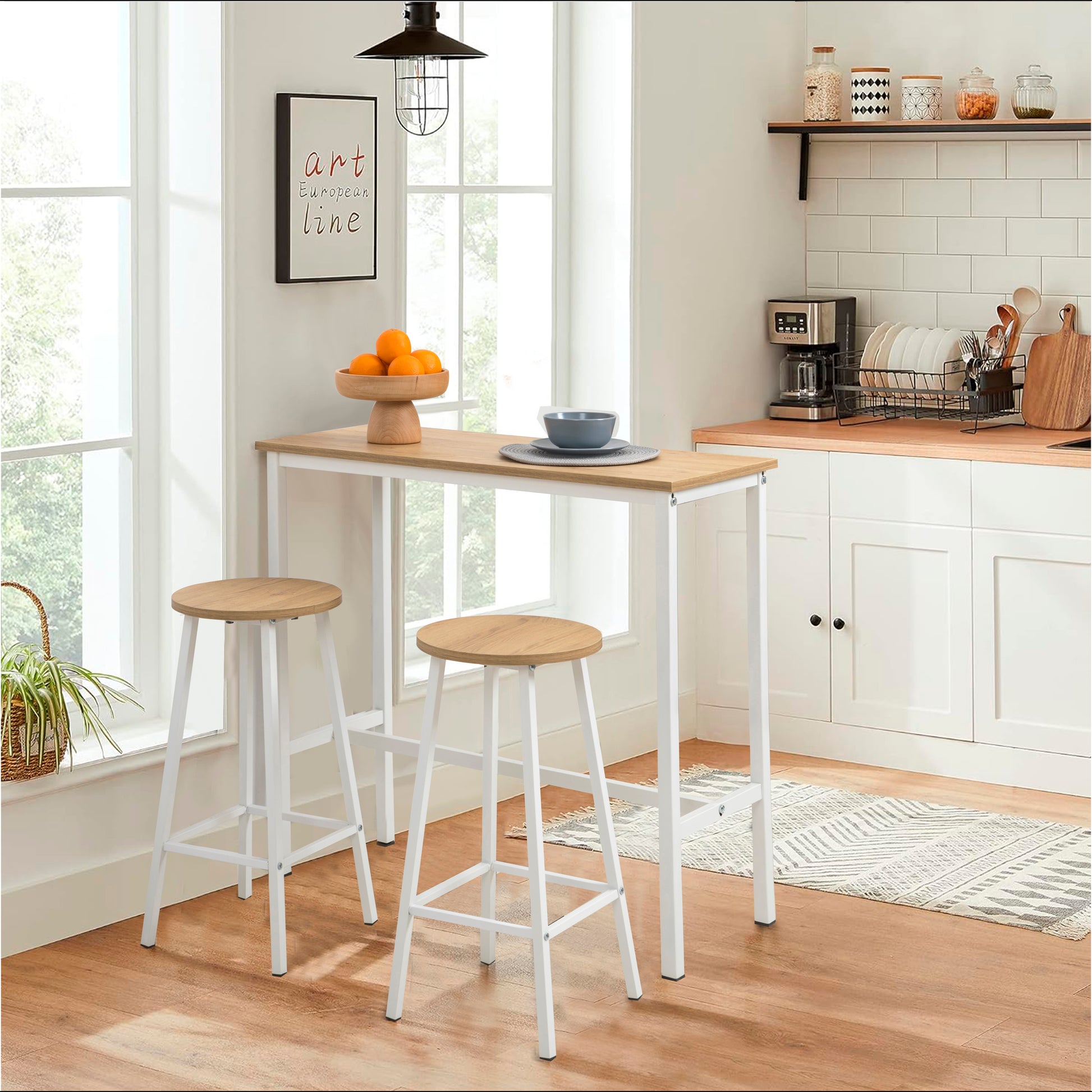 Mola Bar Masası Takımı, Barok Ceviz renginin şıklığını kompakt bir bar konseptiyle buluşturur. 1 Bar Masası + 2 Tabure içeriğiyle dar mutfaklar ve balkonlar için mükemmel bir keyif köşesi yaratır. 100 cm yüksekliğindeki masası ve modern tasarımıyla yaşam alanınıza dinamik bir hava katar.