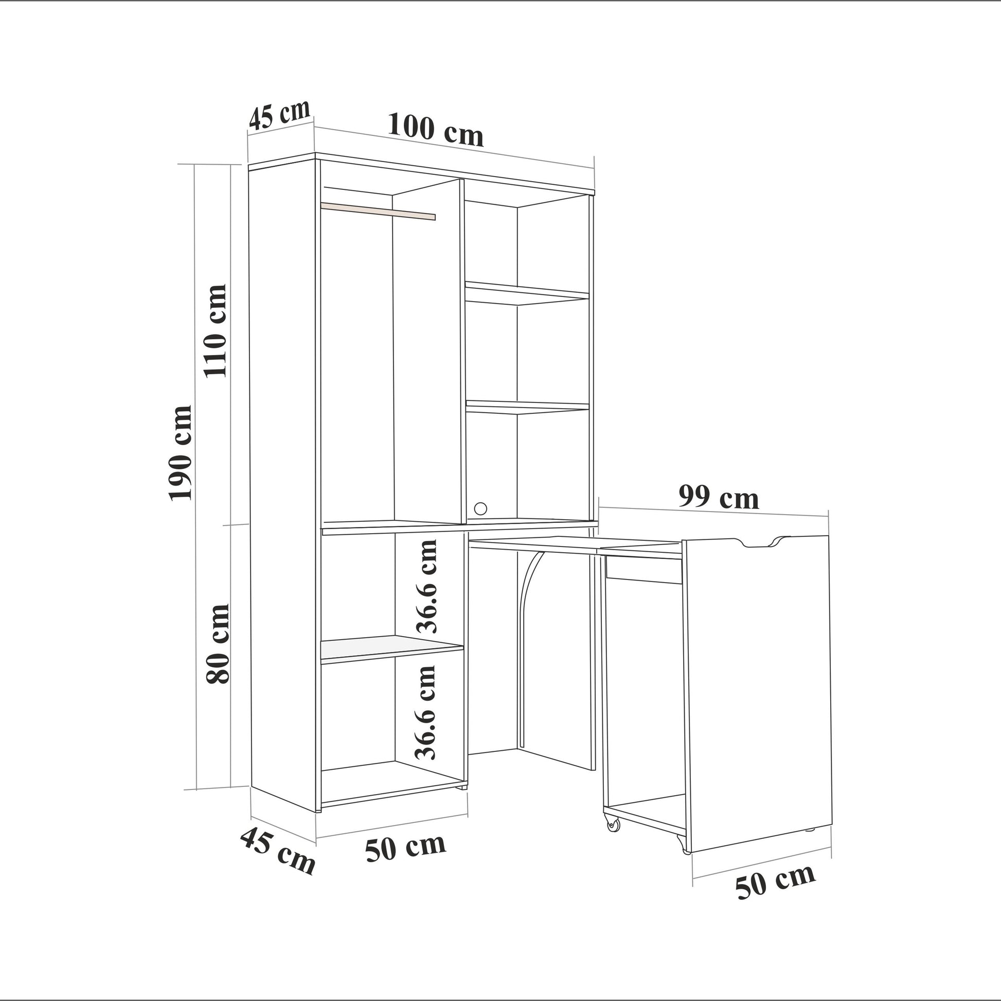 - Yükseklik: 190 cm Genişlik: 100 cm Derinlik: 45 cm (Kapalı)