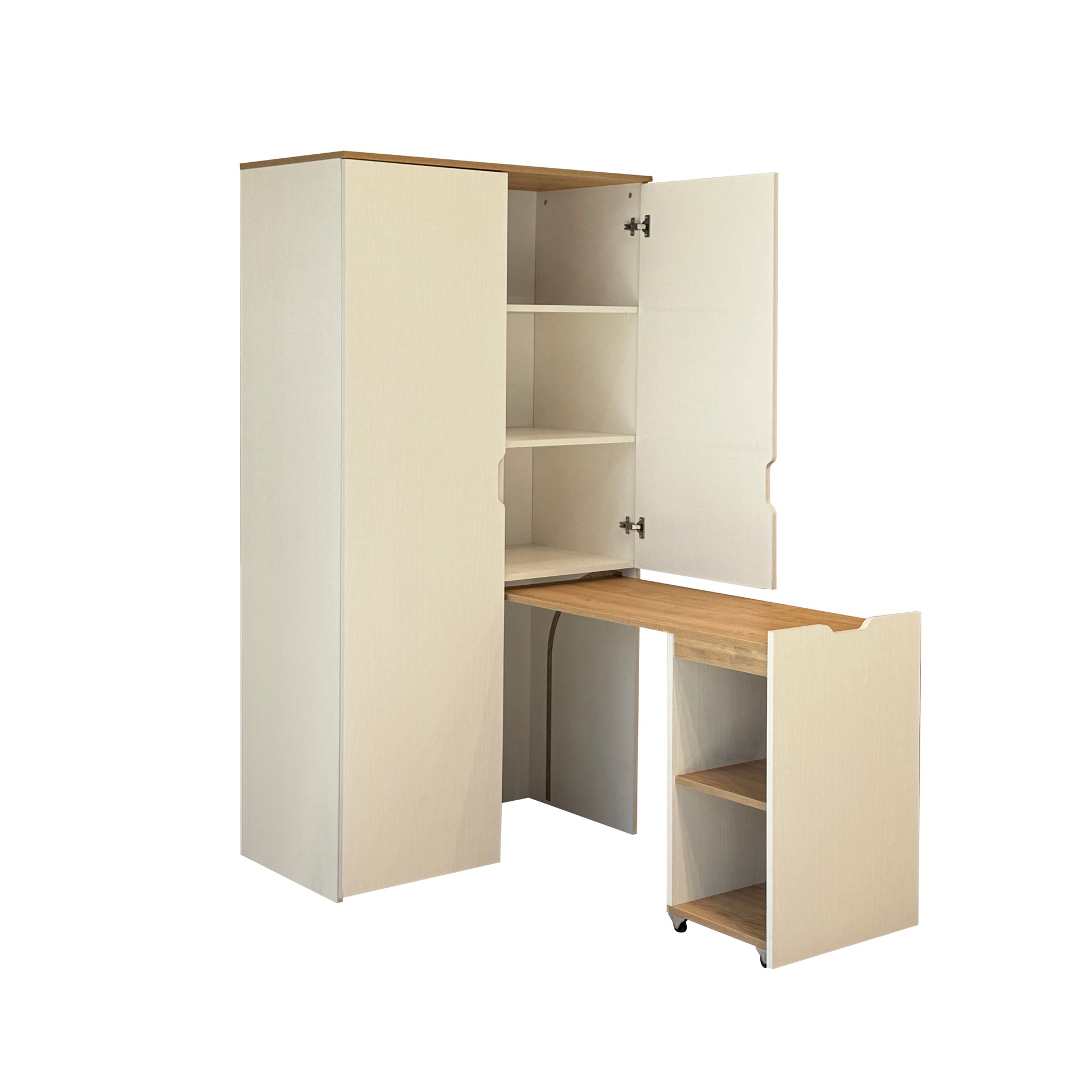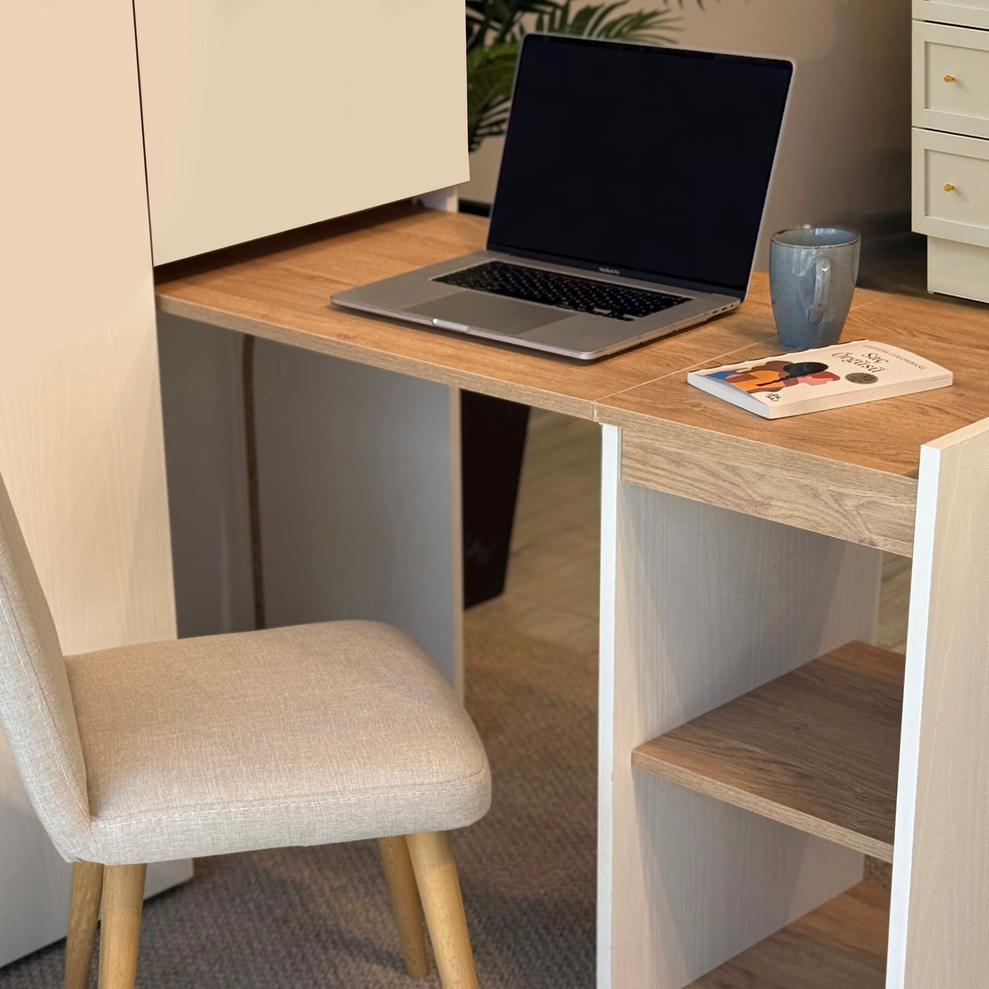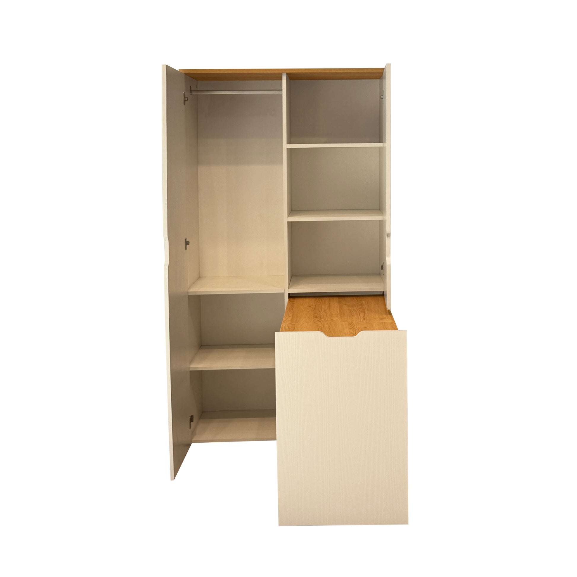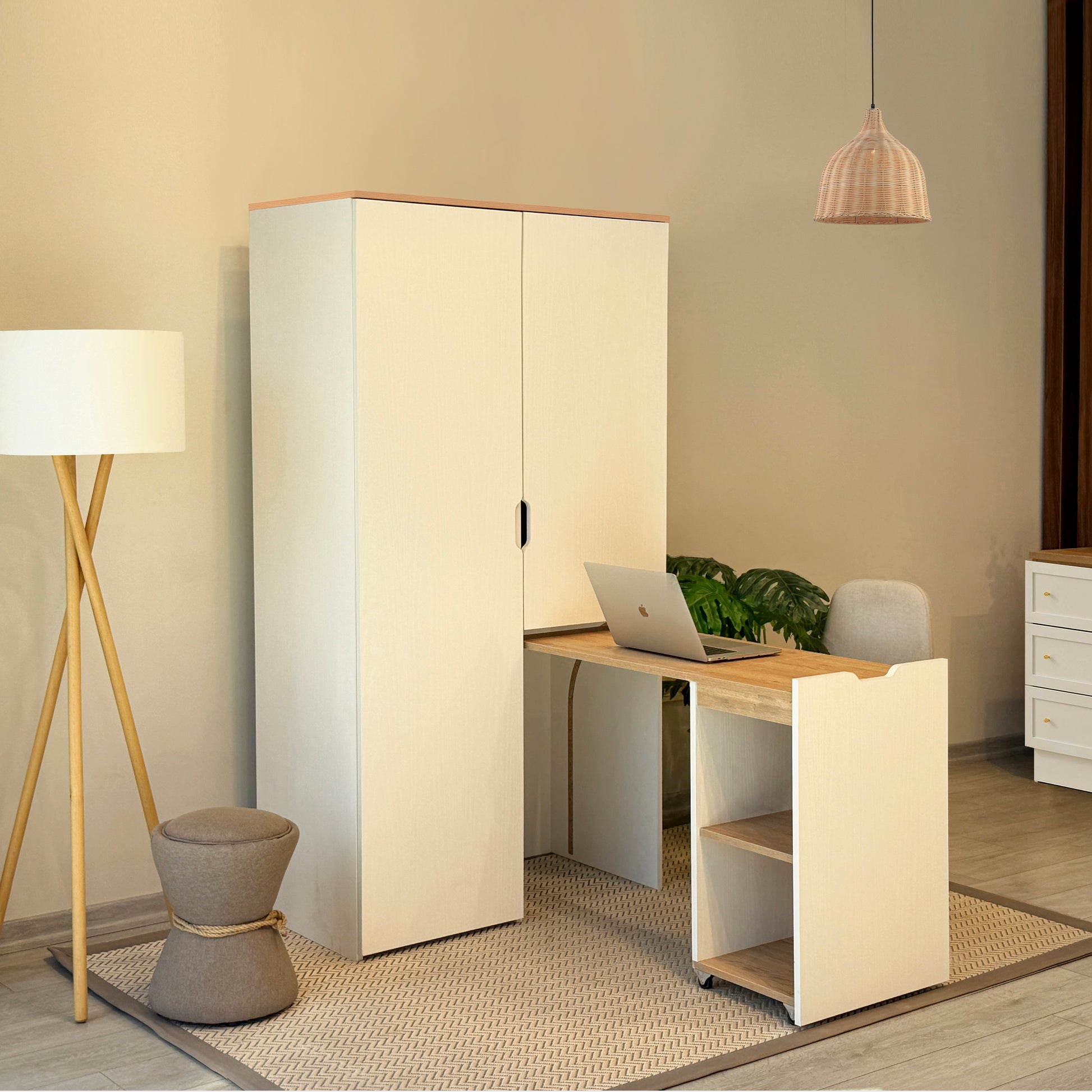 Nova Katlanabilir Çalışma Masalı Gardırop, küçük odalar için tasarlanmış devrim niteliğinde bir çözümdür. Kapalıyken 100 cm genişliğinde şık bir gardırop görünümü sunarken, kapağı açıldığında konforlu bir çalışma alanına dönüşür. Karina ve Sedef renklerinin uyumuyla tasarlanan bu ünite; askılık alanı, geniş rafları ve katlanır masasıyla özellikle genç odaları ve stüdyo daireler için maksimum alan tasarrufu sağlar.