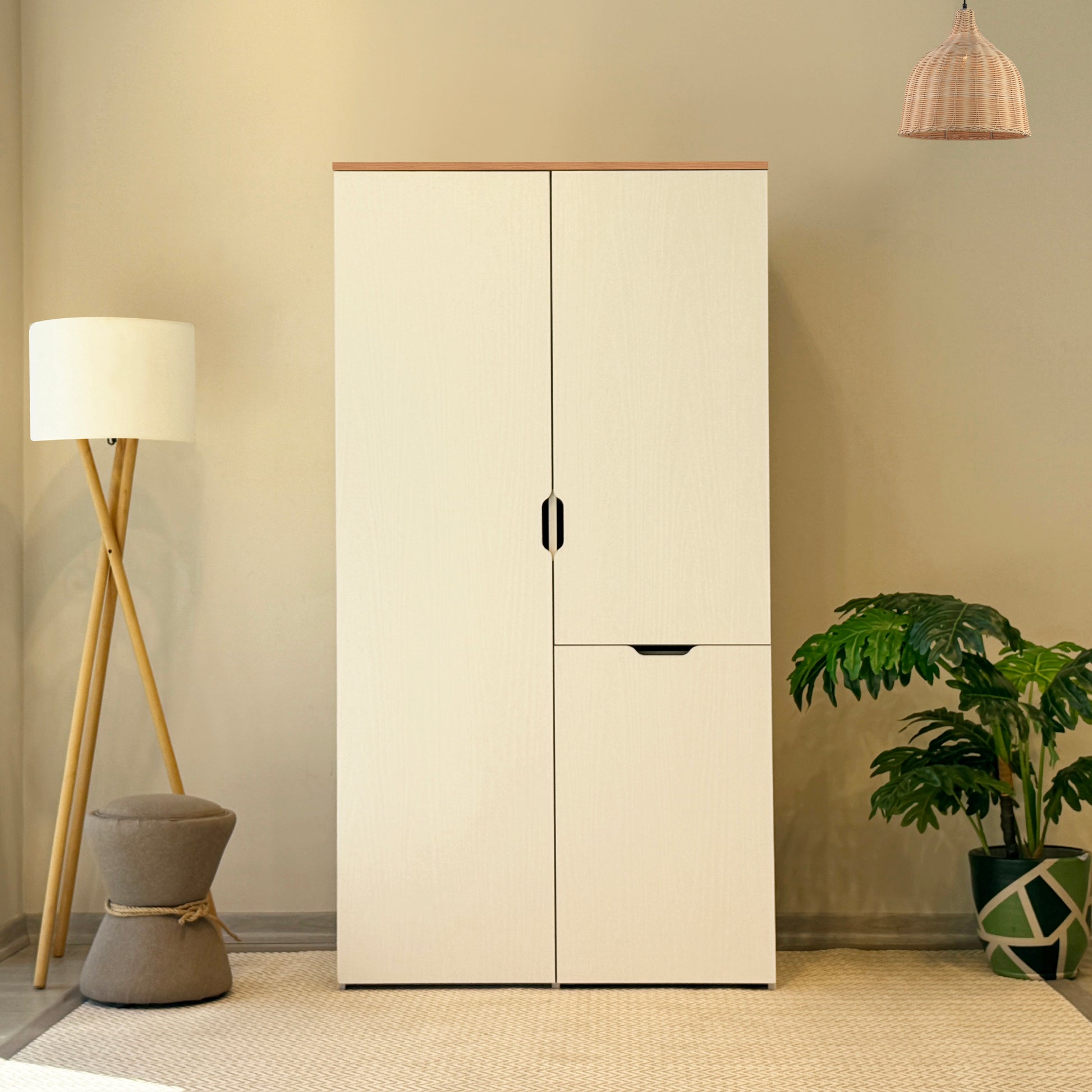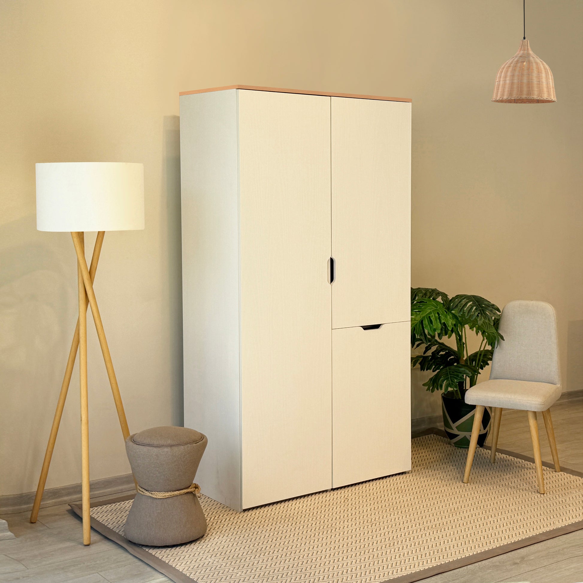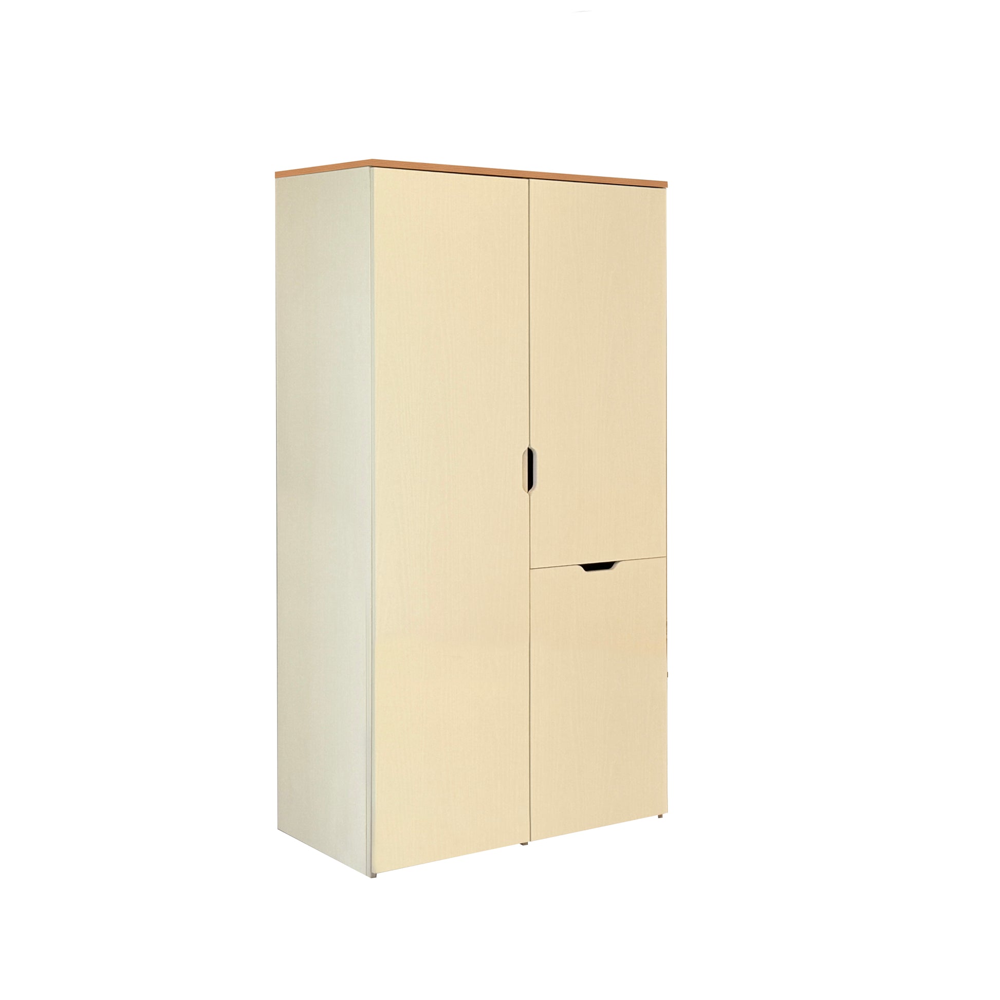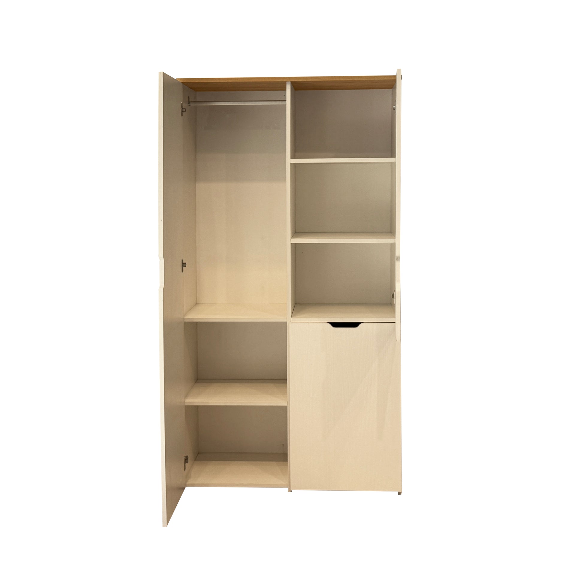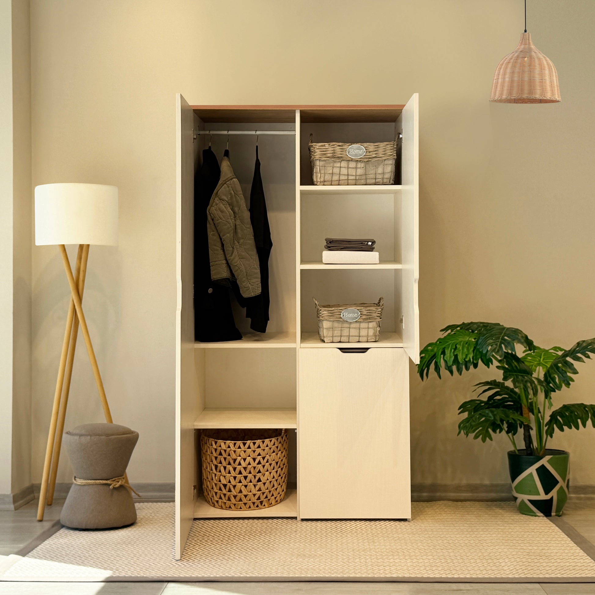 Nova Katlanabilir Çalışma Masalı Gardırop, küçük odalar için tasarlanmış devrim niteliğinde bir çözümdür. Kapalıyken 100 cm genişliğinde şık bir gardırop görünümü sunarken, kapağı açıldığında konforlu bir çalışma alanına dönüşür. Karina ve Sedef renklerinin uyumuyla tasarlanan bu ünite; askılık alanı, geniş rafları ve katlanır masasıyla özellikle genç odaları ve stüdyo daireler için maksimum alan tasarrufu sağlar.